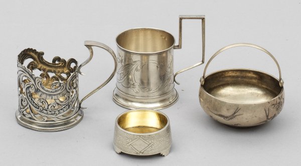A mixed four-piece set of Russian silver tea glass holders, a saliere and a bowl. Partly gilt inside. Standard mark 84, different maker´s marks. Partly assay and master´s mark.