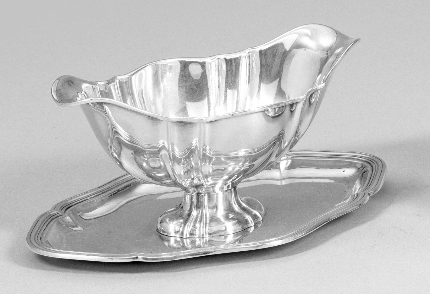 Silber. Ovale, montierte und randprofilierte Unterschale, übergehend in stark eingezogenen, kurzen Schaft und gering gebauchten, schiffchenförmigen Korpus mit weit ausgezogenen, seitlichen Ausgüssen. Die Wandung von vertikalen, gekniffenen Zügen gegliedert. Gest. 800, Herstellerzeichen. Gew. ca. 460 g. H. 9,5 cm. 23 cm x 15,5 cm.