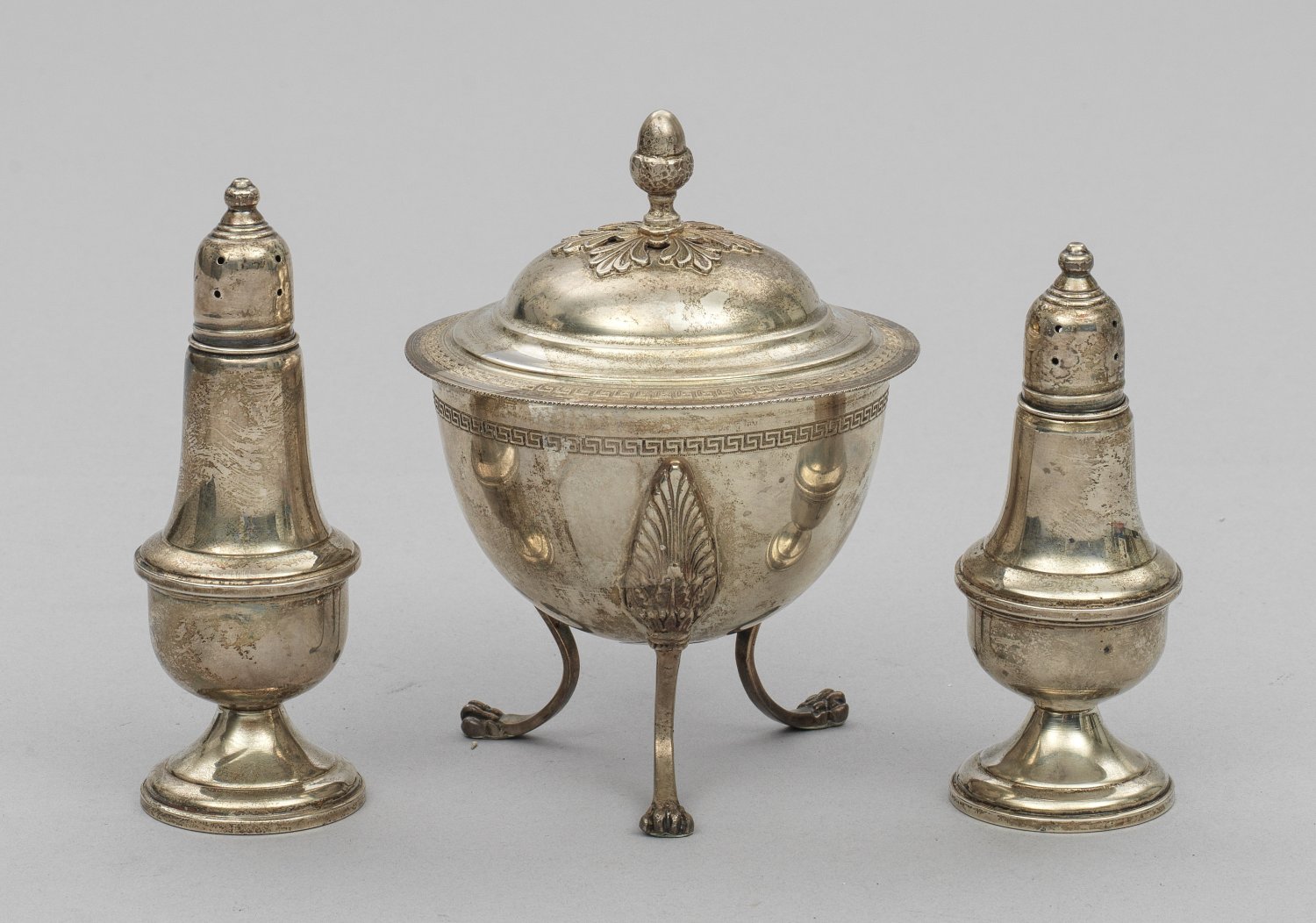 Silber. Balusterförmiger Korpus mit abgesetzter Schulter, beschwert bzw. über drei Tatzenfüßen halbkugeliger Korpus mit Deckel und Pinienknauf. Teilw. innen mit farblosem Glas. Gest. 800, 925. Gew. zus. ca. 515 g. H. 12 cm - 14,5 cm.