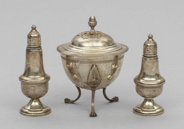 A pair of German Sterling silver weighted salt and pepper shakers with glass insert and a probably Italian lidded bowl. Standard mark 800, 925.