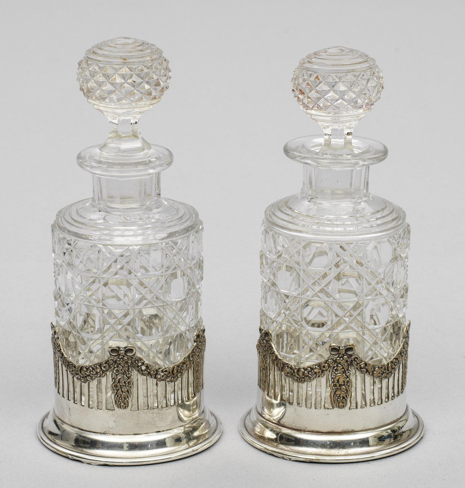 Farbloses Kristallglas sowie Metall versilbert. Zylindrischer Korpus mit Schnittdekor. Gedrückt kugeliger Stopfen. Versilberter Stand mit durchbrochen gearbeitetem Galerierand. H. 17,5 cm.