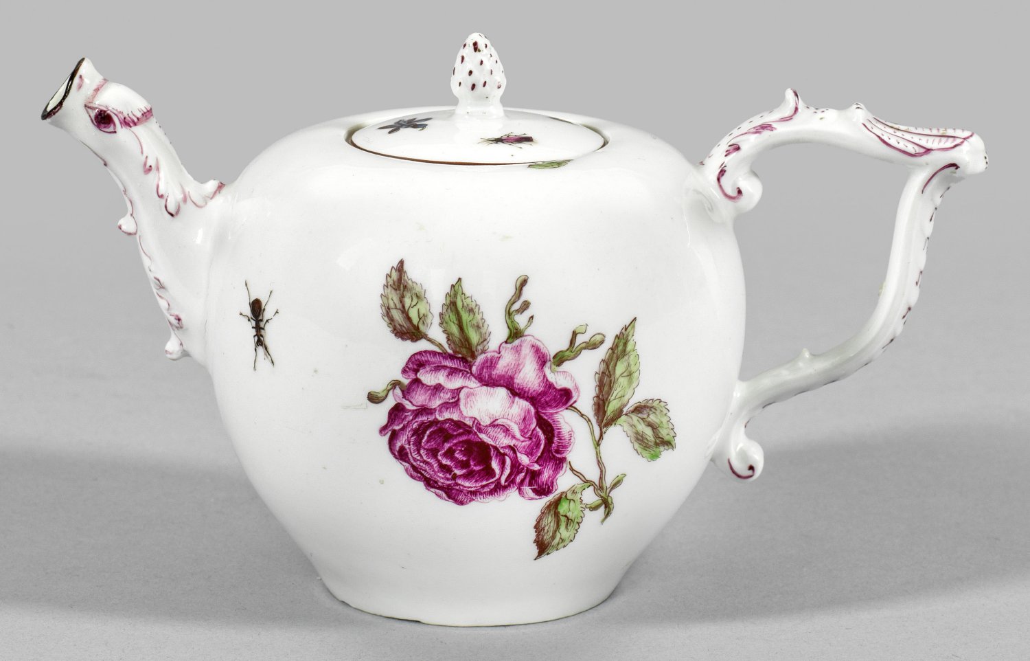 Kugeliger Korpus mit reliefiertem J-Henkel sowie gebogtem Tierkopfausguss. Eingelassener, flach gewölbter Deckel mit Pinienknauf. Beidseitig der Wandung große Holzschnittblume, umgeben von unterschiedlichen Käfern. Korrespondierender Insektendekor auf dem Deckel. Polychrome Malerei mit Purpurstaffage und dunkelbraune Randkonturierung. Minim. rest.; Schwertermarke. H. 10,5 cm.