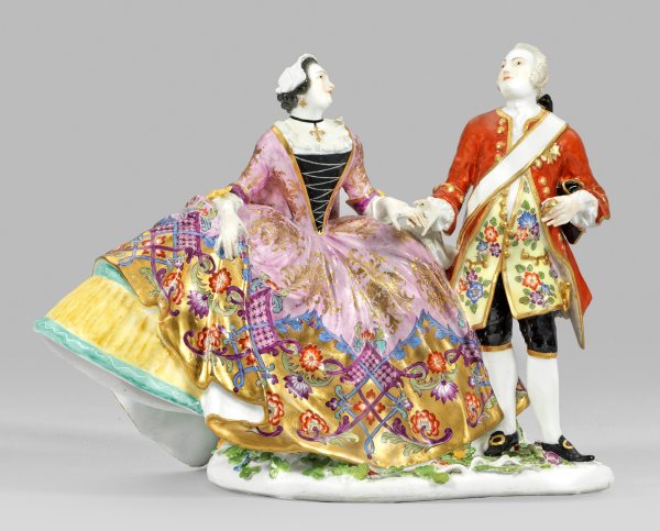 Auf ovalem, mit plastischen Blüten und Rankenwerk belegten Sockel stehender, vornehmer Kavalier in rotem Rock über zartgelber, von Indianischen Blumen gemusterter Weste und weißem Hemd, dazu eine schwarze Kniebundhose und Schnallenschuhe. Über der rechten Schulter eine breite Schärpe, auf der Brust halbverdeckt den Ordensstern des polnischen Weißen-Adler-Ordens tragend. Den Dreizack hat er unter dem Arm geklemmt. In seiner linken Hand hält er eine Schnupftabakdose mit Kauffahrteiszene in Purpur-Camaieu. An der Rechten führt er eine Edeldame in prachtvollem, purpurfarbenem Krinolinenkleid, reich verziert mit goldenen Blütenzweigen und einem breitem, von Laub- und Bandelwerk dekoriertem Goldsaum. Um den Hals eine Kette mit Kreuzanhänger tragend. Das fein gestrichelte Haar ist von einer weißen Haube bedeckt. Wohl die Darstellung von August III., König von Polen mit seiner Gemahlin Maria Josepha von Österreich (Vgl. Lepke's). Äußerst feine, polychrome Malerei "en détail" mit reicher Goldstaffage. Entw. Johann Joachim Kaendler, Juni 1744. Rest.; H. 22 cm. 30 cm x 18 cm.