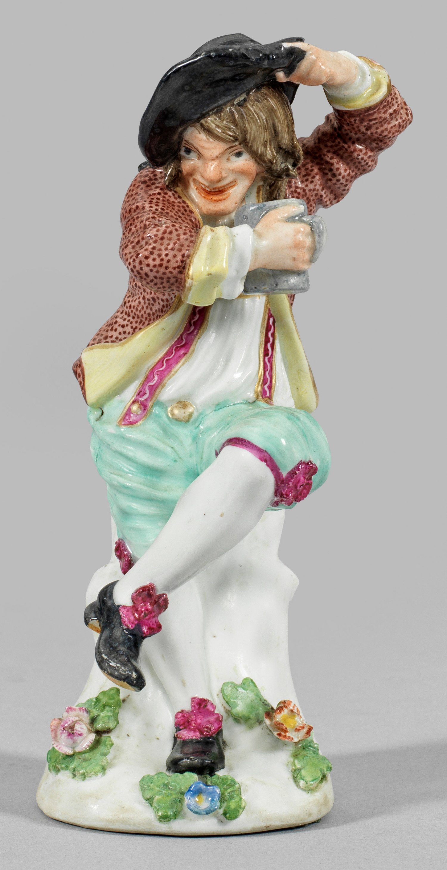 Mit plastischen Blüten und Blättern belegter Sockel mit Baumstütze. Im ausgelassenen Tanzschritt stehender, trinkender Bauer. Das rötliche, lachende Gesicht mit weit aufgerissenen Augen und hochgezogener Stirn. Gekleidet in eine rotbraun gepunktete Jacke mit gelbem Futter über weißem Hemd und purpurfarbenen Hosenträgern sowie schleifenbesetzter, seegrüner Kniebundhose und schwarzen Schuhen. Auf dem Kopf einen schwarzen Hut tragend. In der rechten Hand einen grauen Maßkrug tragend. Mit der Linken den Hut haltend. Polychrome Malerei mit Goldkonturierung. Entw. Johann Joachim Kaendler, um 1736. Altes Händleretikett "Antique company of New York, Inc.". Produktionsbedingter Brandriss. Minim. rest./best.; Verwaschene Schwertermarke. H. 17 cm.