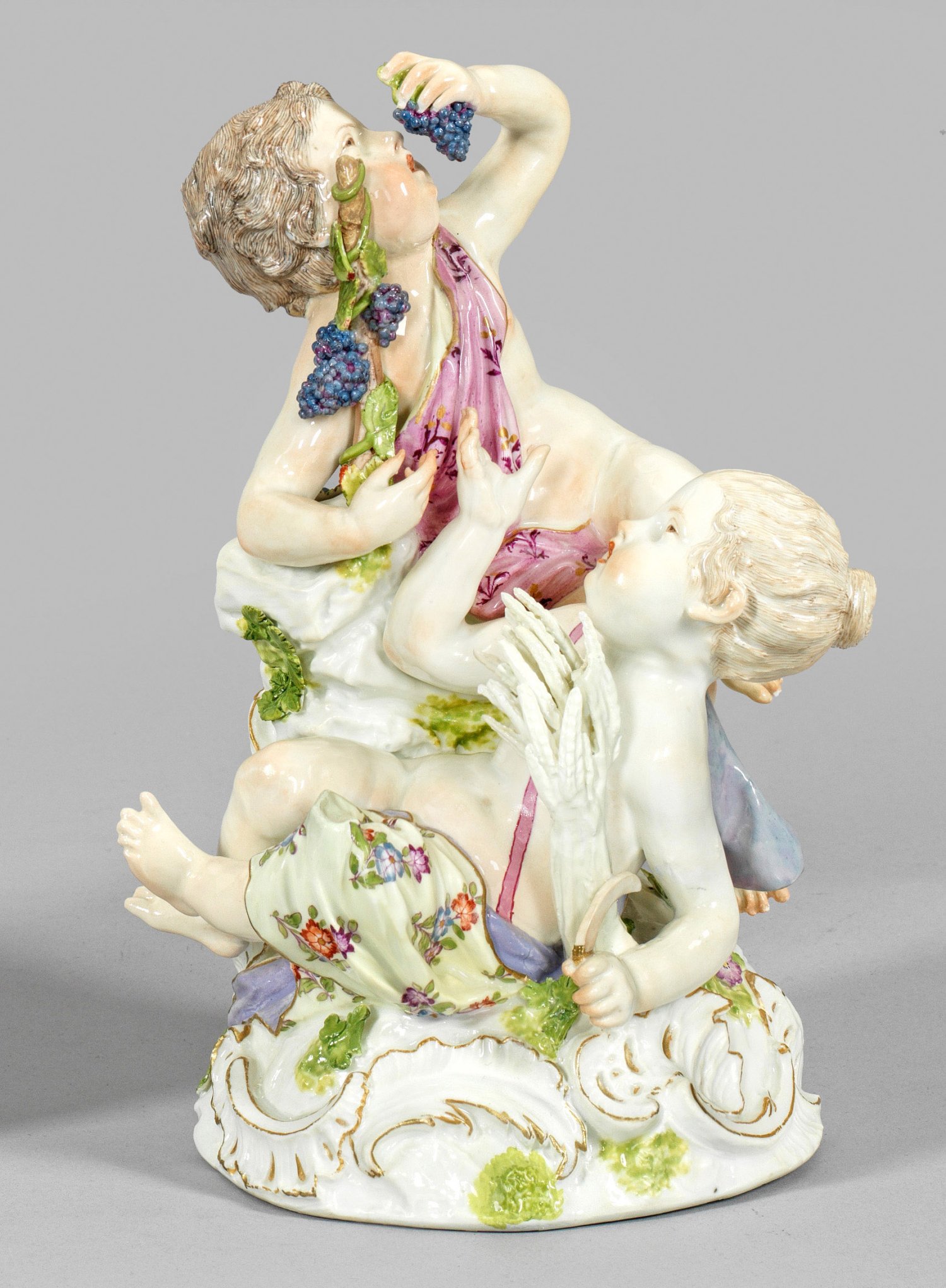 Auf hohem, reliefplastischem, mit plastischen Blüten und Blättern belegtem Rocaillesockel komponiertes Puttenpaar mit Sichel und Ährenbündel bzw. Weinreben als Allegorie auf den Sommer und Herbst. Polychrome Malerei mit Goldstaffage. Entw. Friedrich Elias Meyer. Rest.; Best.; Schwertermarke. H. 25 cm.