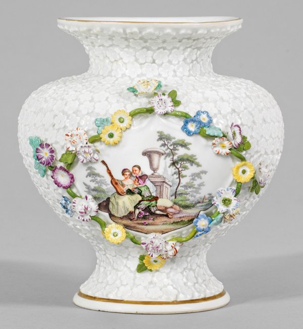 Gedrückte Balusterform mit flacher Schulter, kurzer, eingezogener Hals in weit ausschwingende Mündung übergehend. Auf der Wandung flächendeckender Fond aus dicht aufgelegten Vergissmeinnichtblüten. Beidseitig passig ausgesparte Reserven, umgeben von plastisch ausgeformten, sich filigran verzweigenden Blüten- und Blattranken. In den Kartuschen Watteaumalerei mit musizierenden Personen in parkartiger Landschaft. Polychrome Malerei. H. 14,5 cm.