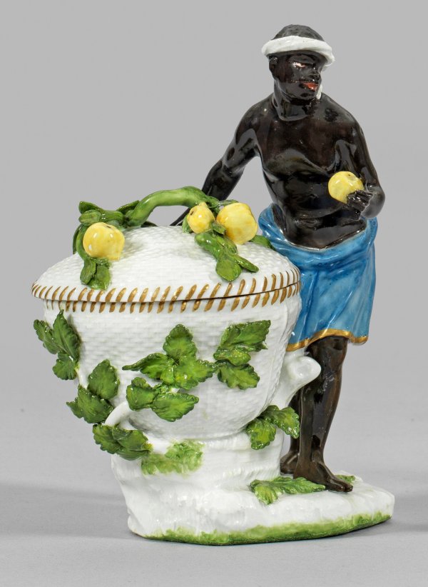 Auf naturalistisch gearbeitetem Sockel stehende Mohrin mit Zitrone, bekleidet mit Lendenschurz und Stirnband. Vor sich ovale, innen vergoldete Korbschale mit Ozier-Reliefdekor und plastisch aufgelegtem Blätter- und Fruchtzweig. Polychrome Malerei mit Gold. Entw. Johann Joachim Kaendler und Johann Friedrich Eberlein. Rest.; Schwertermarke. H. 16,5 cm.