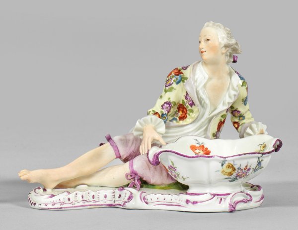 Auf rocaillereliefiertem Sockel liegender junger Kavalier in zartgelber, von indianisch geblümter Jacke, weißem Hemd und rosafarbener Kniebundhose, mit beiden Händen eine ovale Schale haltend. Schalenwandungen mit Blumendekor. Polychrome Malerei mit Purpurkonturierung. Entw. Johann Joachim Kaendler. Unw. rest.; Schwertermarke. H. 12 cm. L. 19 cm.