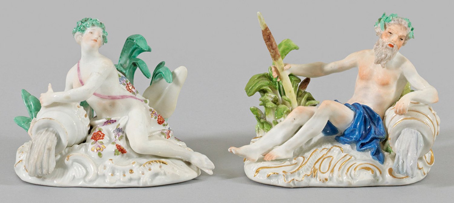 Gegenstücke. Auf rocailleförmig gerahmtem Sockel zwischen plastisch gearbeitetem Schilf sitzender Flussgott und Quellnymphe. Seitlich liegende Amphorenvase, das Ewige fließende Wasser symbolisierend. Polychrome Malerei mit Goldkonturierung. Entw. Johann Joachim Kaendler. Schwertermarke. H. 7 cm - 7,5 cm.