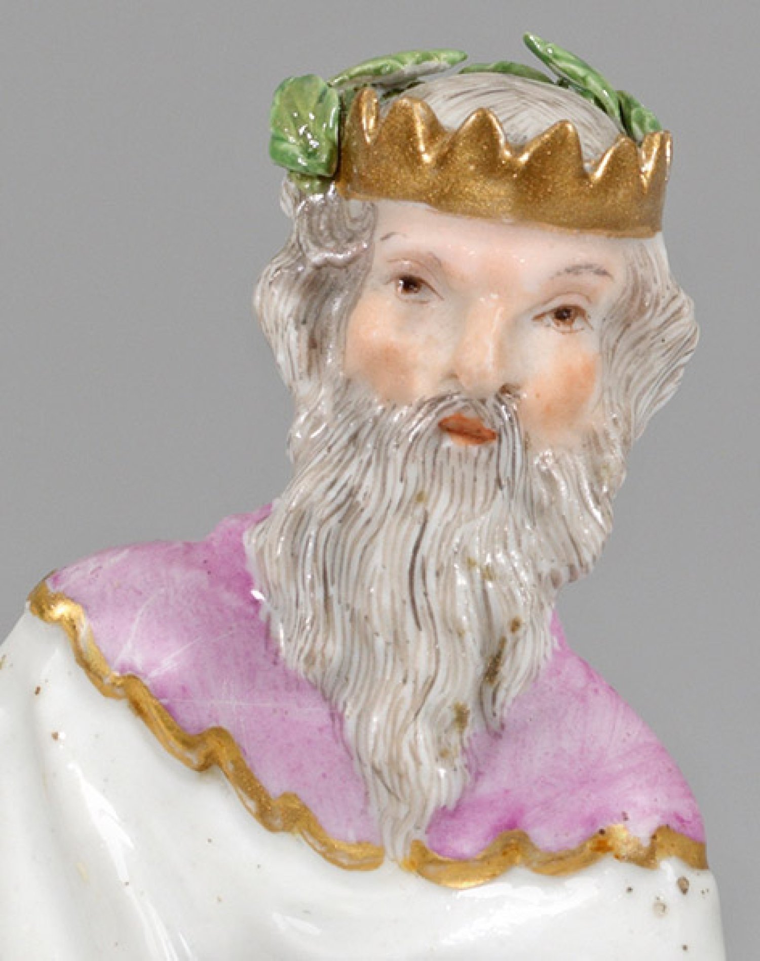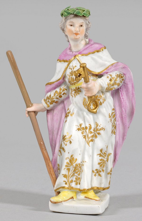 Auf rechteckiger Plinthe stehender, doppelgesichtiger Gott Janus als lorbeerbekrönte Nymphe Carna mit Pförtnerstab und Schlüssel sowie rückseitig als bärtiger Mann mit goldener Krone. Entw. Johann Joachim Kaendler. Polychrome Malerei mit Goldstaffage. Unw. rest.; Schwertermarke. H. 12,5 cm.