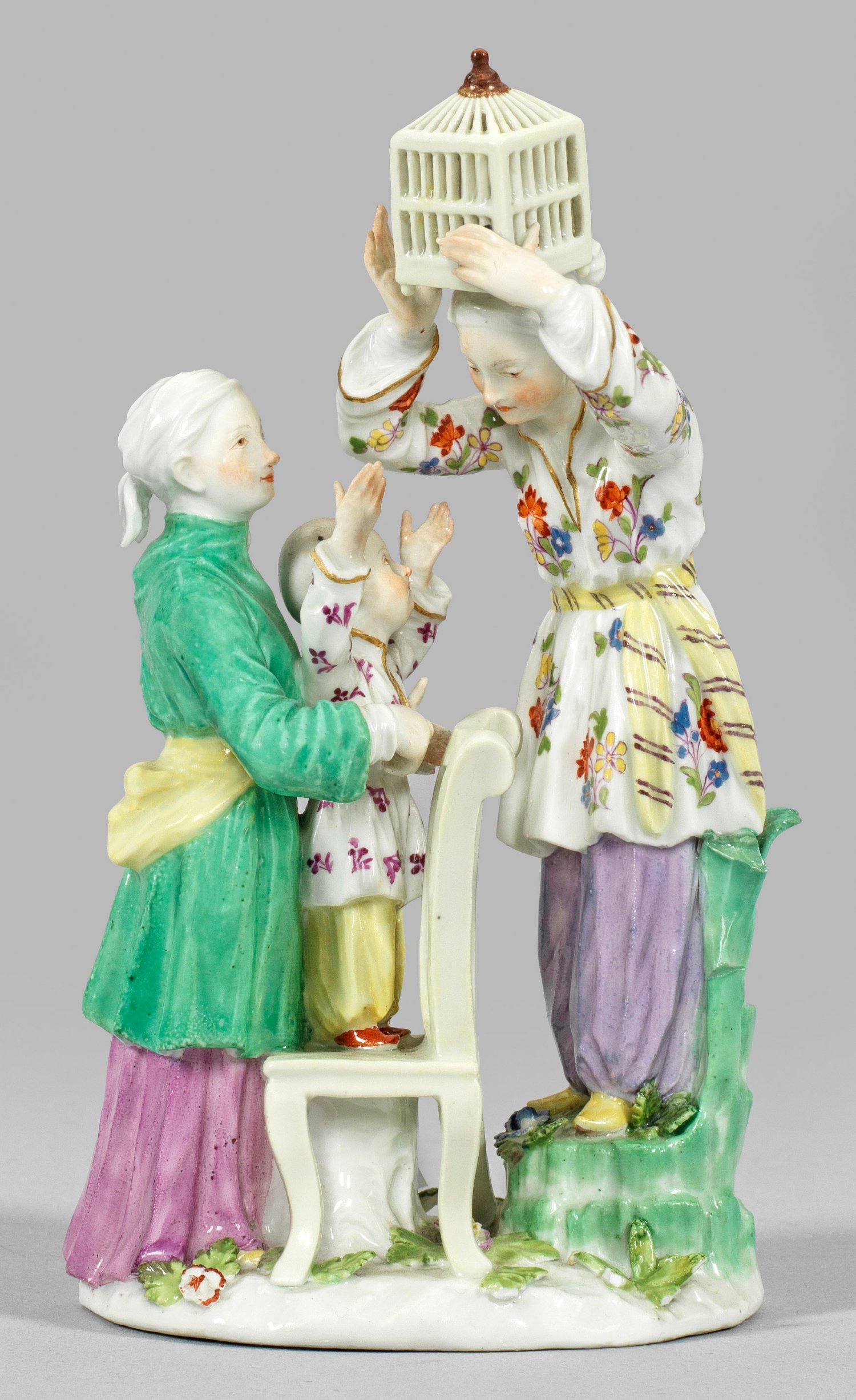 (bzw. "Japanergruppe mit Vogelbauer"). Ovaler, mit plastischen Blüten und Blättern belegter Sockel. Auf einem Palmenstumpf erhöht stehende Chinesin, in ihren erhobenen Händen einen Vogelkäfig haltend. Neben ihr auf einem Stuhl sich emporstreckendes Kind, nach dem Vogelbauer greifend. Hinter ihnen stehendes Mädchen, das Kind haltend. Polychrome Malerei mit dezenter Goldkonturierung. Entw. wohl Johann Joachim Kaendler oder Peter Reinicke. Unw. best.; H. 17 cm.