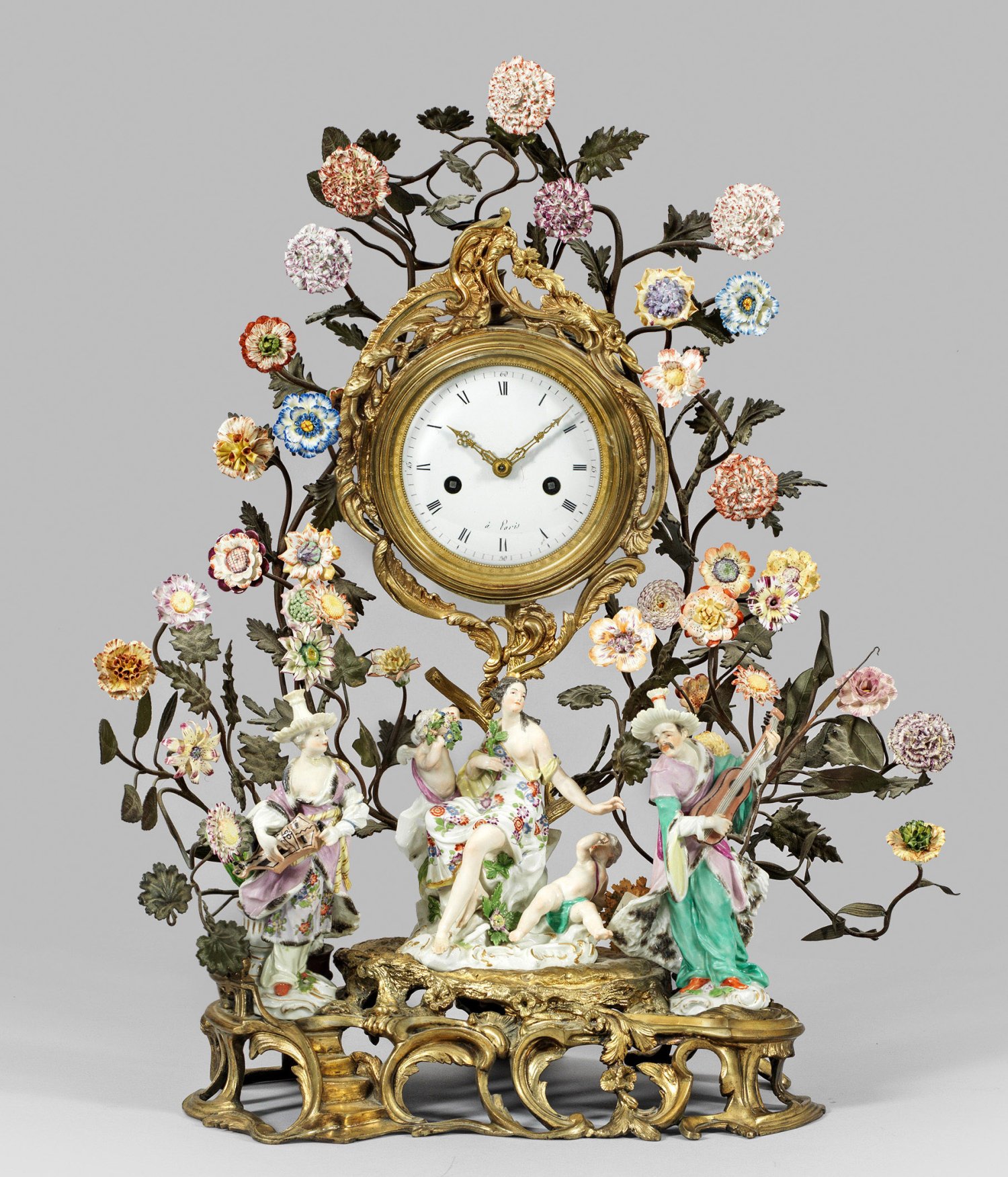 Hoher rocailleförmig durchbrochen gearbeiteter, vergoldeter Bronzesockel mit fünfstufiger Treppe und angrenzendem Ziergeländer. In der Mitte eingelassene goldstaffierte, rocailleförmig gerahmte Bodenplatte. Auf felsiger Anhöhe komponierte Gruppe. Sitzende bekrönte junge Dame in, mit sog. Indianischen Blüten dekoriertem, weißem Kleid, umgeben von zwei spielenden Amoretten. Beidseitig geringfügig vertieft stehende, musizierende Malabaren. Malabarin in pelzgefüttertem, rosafarbenem Mantel über blumig gemustertem Gewand und langer gelber Hose. In ihrem rechten Arm eine Drehleier haltend. Als Gegenstück bärtiger Malabar, ein Saiteninstrument spielend (im 19. Jh. erg.). Rückseitig aufsteigende Blütenzweige aus grün gefasstem Eisen mit farbig staffiertem, sog. Vincennes-Blüten. Hoher, verästelter Bronzestamm als Träger für kartuschenartig gerahmtes, rundes Uhrengehäuse. Verglastes Emailzifferblatt mit schwarzen römischen und arabischen Zahlen, bez. "á Paris". Halb- und Stundenschlag auf Glocke. Fadenaufhängung und Sonnenpendel. Polychrome Malerei mit Goldstaffage. Entw. Friedrich Elias Meyer. Minim. rest./rep.; H. 60 cm. 50 cm x 23 cm.