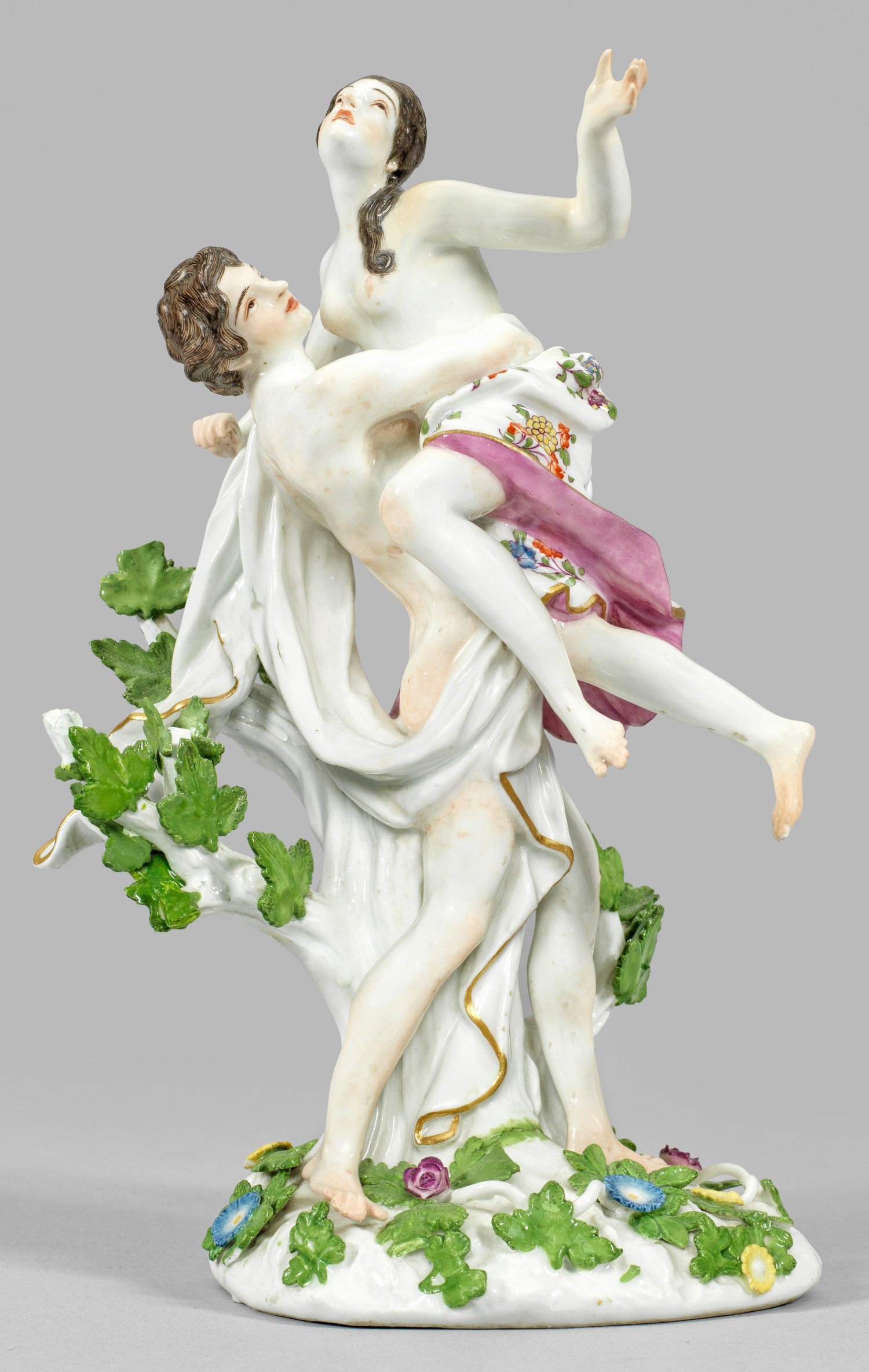 Auf ovalem, mit plastischen Blüten und Blättern belegtem Sockel an einem Baumstamm stehender Boreas. Auf seiner linken Schulter die geraubte Sabinerin Oreithyia mit weißem, von Indianischen Blumen gemustertem Hüfttuch davontragend. Polychrome Malerei mit Goldkonturierung. Entw. Johann Joachim Kaendler, 1748. Partiell rest./best.; Schwertermarke. H. 23 cm.
