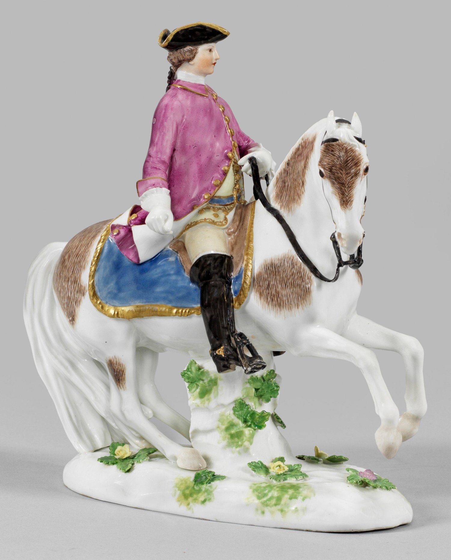 Ovaler, mit plastischen Blüten und Blättern belegter Natursockel. Zu Pferd, über blauer Schabracke sitzender Kavalier in purpurfarbener Jacke über zartgelber, goldverzierter Weste und schwarzem Dreizack. Mit der linken Hand die Zügel haltend. Polychrome Malerei mit reicher Goldstaffage. Entw. Friedrich Elias Meyer, 1759. Unw. rest.; H. 18 cm. L. 17 cm.