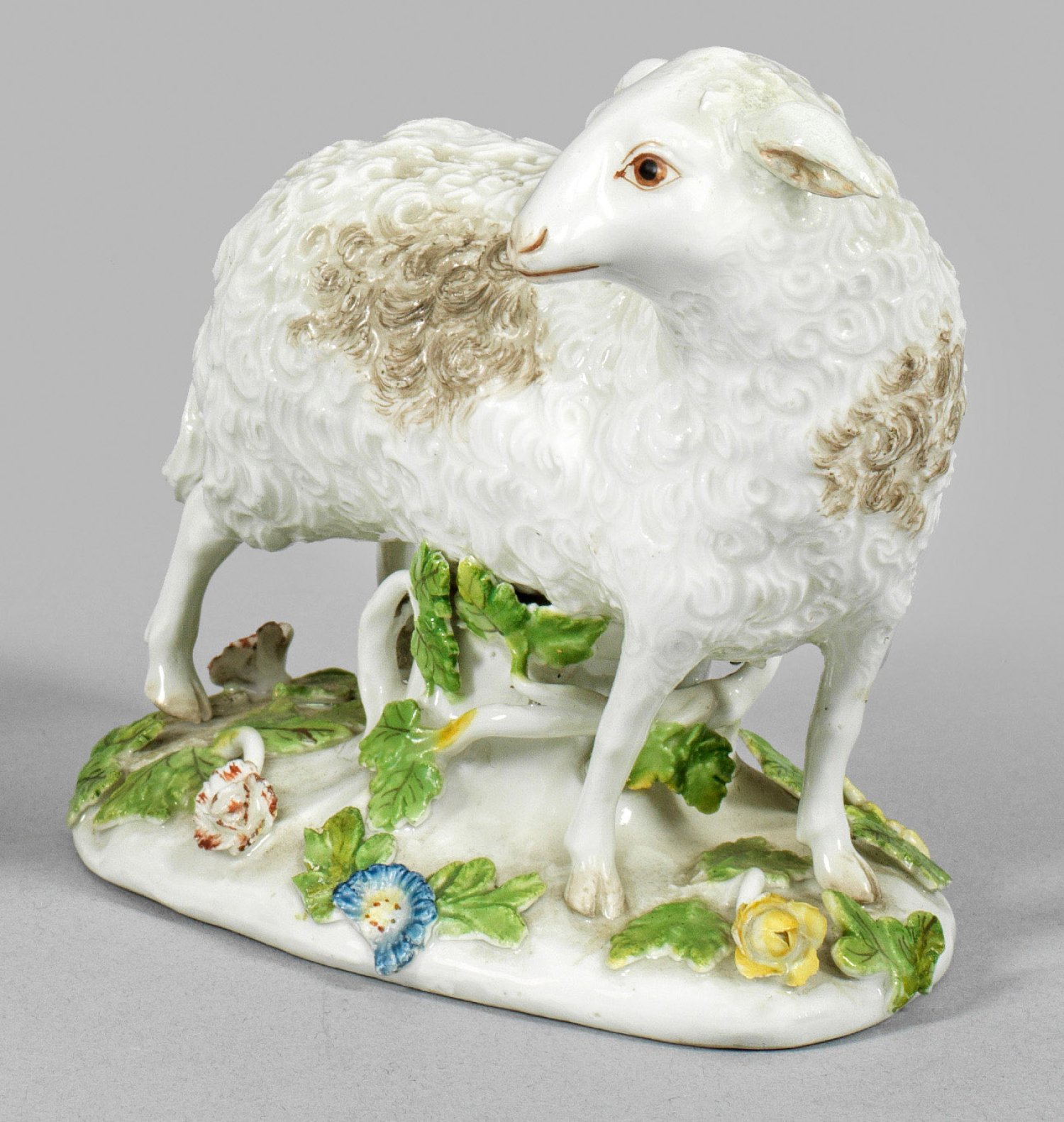 Auf plastisch mit Blüten und Blättern belegtem Sockel stehendes Schaf, den Kopf nach rechts geneigt.