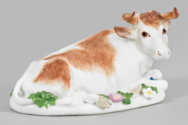Auf einem mit plastischen Blüten und Blättern belegtem Sockel liegender Ochse mit geflecktem, fein gezeichnetem Fell, den Kopf nach rechts gewandt. Polychrome Malerei. Entw. Johann Joachim Kaendler. Unw. rest.; Schwertermarke. H. 10 cm. L. 17 cm.
