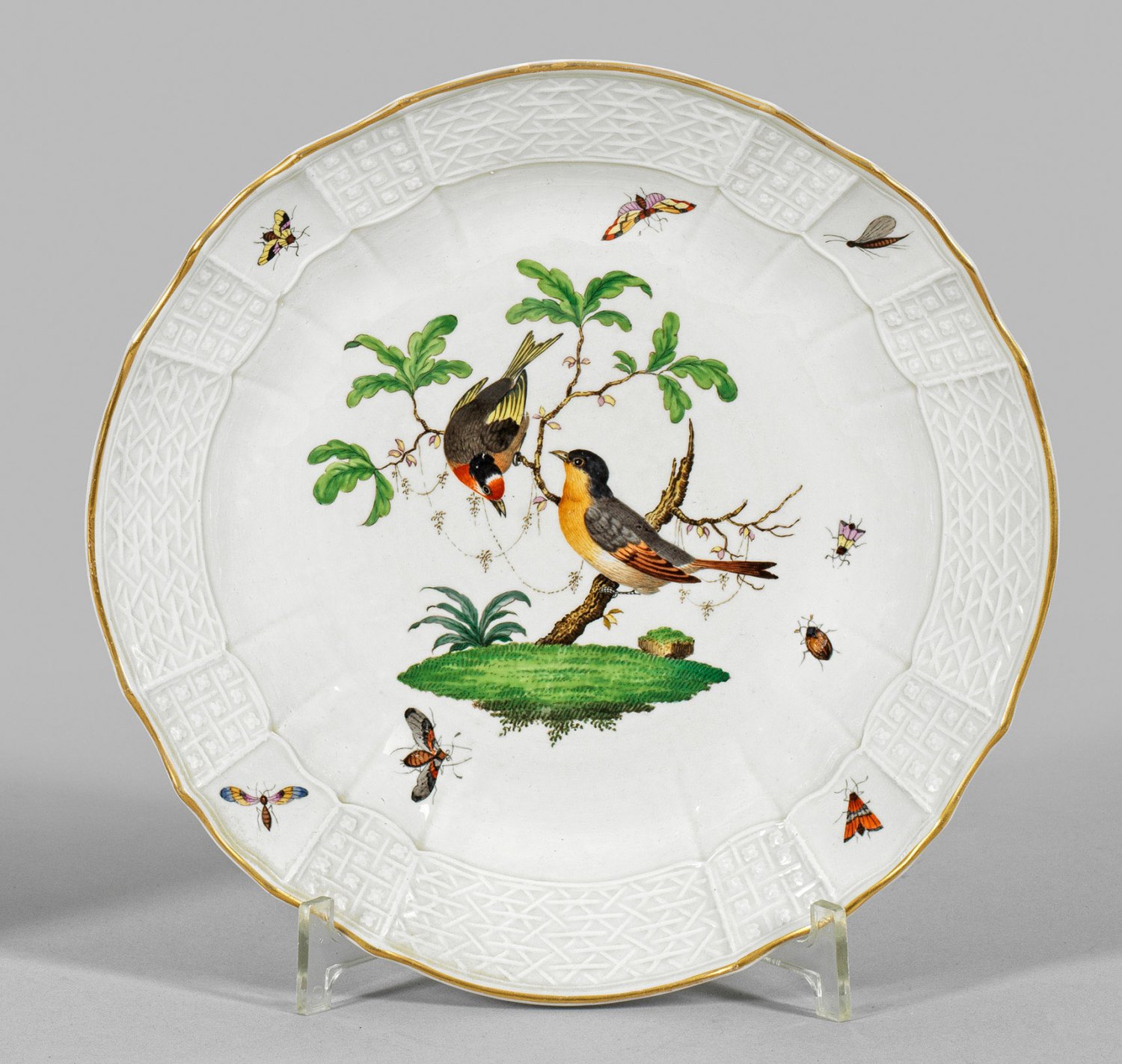 Vertiefter Spiegel, Altbrandenstein-Reliefrand. Im Spiegel zwei Vögel auf einem Ast sitzend, auf der Fahne und in vier unreliefierten Randsegmenten einzelne Insekten in polychromer Malerei. Goldrand. Gold und Malerei minim. ber.; Stand minim. best.; Schwertermarke. D. 26 cm.
