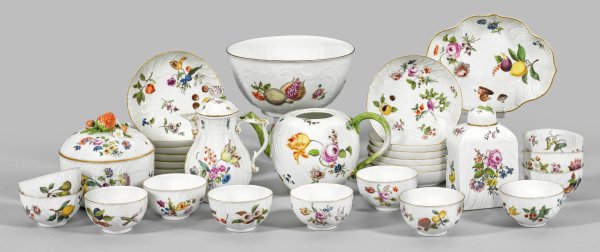 für 12 Personen. 18-tlg.; 12 Koppchen mit Unterschalen, Tee- und Heißwasserkanne, Tee- und Zuckerdose, 2 unterschiedliche Anbietschalen. Teilw. "Neuozier"-, teilw. "Altbrandenstein"-Reliefrand. Deckelknäufe plastisch aufgelegt in Form einer Blüte bzw. einer Erdbeere. In Spiegel, auf Wandung und auf Deckel Blumen, Früchte und Nüsse in polychromer Malerei. Teilw. Goldrand. Teilw. minim. ber./best.; ein Haarriss, Deckel fehlt.; Schwertermarke. Kannen-H. 16 cm, Schalen-D. 17 cm.