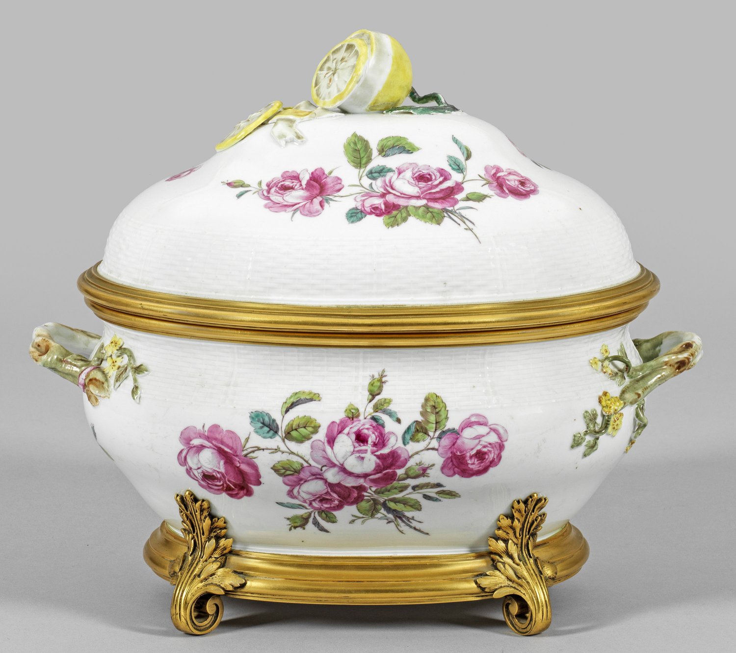 Ovaler, gebauchter Korpus auf Füßen, gewölbter Deckel mit plastischem Knauf in Form einer angeschnittenen Zitrone. "Osier"-Reliefdekor, Handhaben in Form von plastisch ausgeformten, blütenbesetzten Ästen. Auf Wandung und Deckel einzelne und zu Buketts arrangierte Rosen in polychromer Malerei. Vergoldete Bronzemontierung um Rand und Stand. Zeptermarke. H. 32 cm. D. 32 cm.