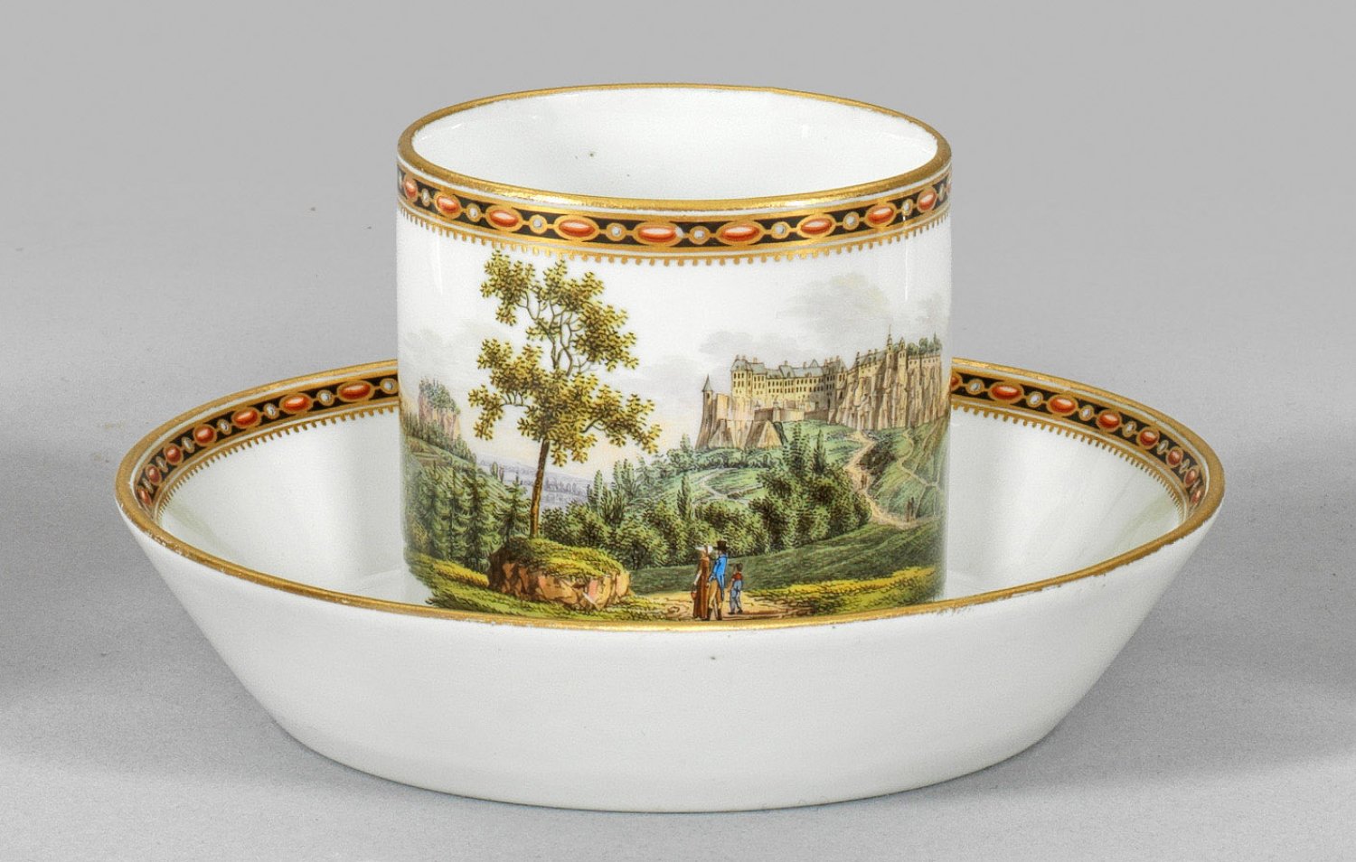 mit Untertasse. Zylindrisch mit gekantetem Henkel. Schauseitig Landschaftsvedute mit Figurenstaffage und Ansicht auf die Festung Königstein sowie das Elbsandsteingebirge. Im Spiegel sog. Canaletto-Blick auf Dresden auf Augustusbrücke, Brühlsche Terrasse, Frauenkirche und Residenzschlosses in feiner, polychromer Malerei. Umlaufende, ornamentale Randbordüre. Im Boden bez.; Schwertermarke. H. 7 cm.