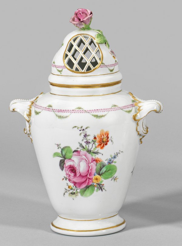 Balusterform, durchbrochen gearbeiteter Deckel mit Knauf in Form einer plastisch ausgeformten Rosenblüte. An Schulter und Deckelrand Bordüre mit um Band gewundenem Laub, beidseitig der Wandung große Blumenbuketts in polychromer Malerei. Goldstaffage. Minim. best.; Manufakturmarke. H. 38 cm.