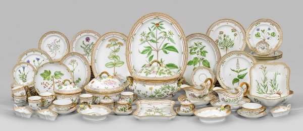 Die ersten Entwürfe zum "Flora Danica"-Dekor entstehen ab 1790 im Auftrag des dänischen Königshauses. Das erste fertige Service, ursprünglich als Geschenk für Zarin Katharina II. konzipiert, verbleibt nach zwölf Jahren der Konzeption und Überarbeitung letztendlich im Besitz der königlichen Familie, da die geplante Empfängerin in der Zwischenzeit verstorben ist. "Flora Danica"-Porzellan, das sich an den Arbeiten des Botanikers Carl von Linné orientiert und ebenso naturgetreu wie detailreich die Pflanzenwelt Dänemarks abbildet, wird noch heute in traditioneller Handarbeit gefertigt und bemalt. Es zählt es zu den prestigeträchtigsten Servicen der Welt.