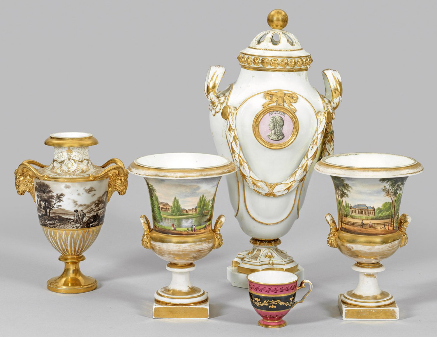 Unterschiedliche Formen. Ansichten und Landschaftsveduten mit Figurenstaffage, u.a. große Fürstenberg-Potpourrivase mit antikisierenden Portraitmedaillons von Apuleus bzw. Zeno. Polychrome sowie Grisaille- und Schwarzlotmalerei. Golddekor. Teilw. stark besch.;/rep./rest./ber.; Teilw. Manufakturmarken. Beigabe: Glockenbechertasse, im Boden bez. Sèvres (?) in Gold. Vasen-H. 25 cm - 49 cm.