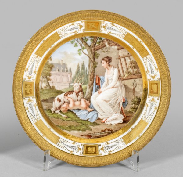 Runde Form, unglasierter Goldrand mit Kymation-Relieffries. Im leicht vertieften Spiegelmedaillon Darstellung einer jungen, sitzenden Dame im Empire-Kleid vor prächtiger Architekturkulisse. Am Boden liegendes, von einer Ziege gesäugtes Kind. Polychrome Malerei. Auf der Fahne umlaufende goldradierte Bordüre aus Motivreserven und Ornamentik. Minim. ber.; Manufakturmarke mit Bez. "Par brevet d'inv.tion" in Gold. D. 24 cm.