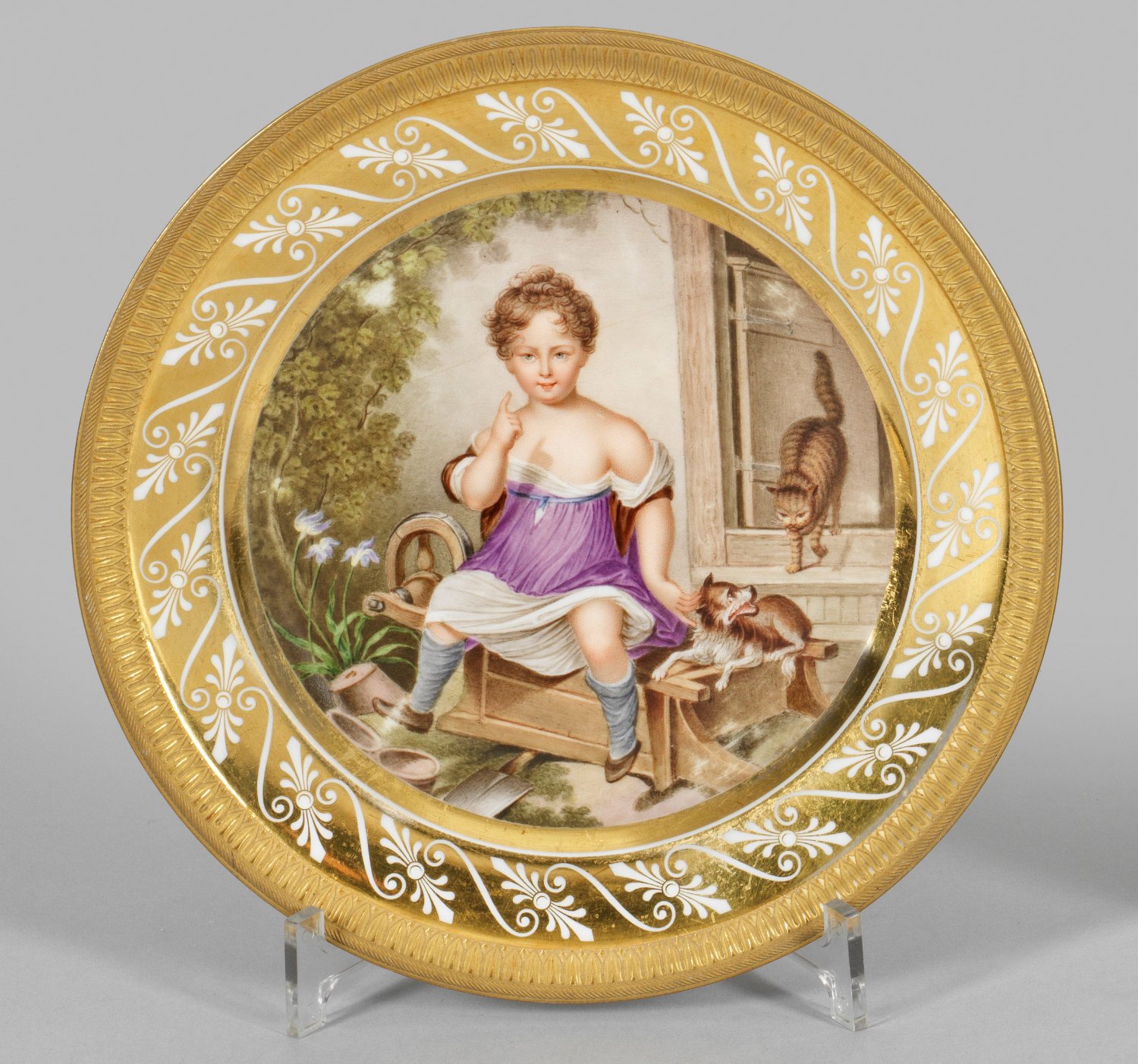 Runde Form, unglasierter Goldrand mit Kymation-Relieffries. Im leicht vertieften Spiegelmedaillon szenische Darstellung eines jungen, auf einem Karren sitzenden und einen Hund streichelnden Mädchens vor Hauskulisse, in polychromer Malerei. Auf der Fahne umlaufende, in Goldfond ausgesparte, florale Ornamentbordüre. Haarrisse. Manufakturmarke mit Bez. "Par brevet d'inv,on" in Gold. D. 24 cm.