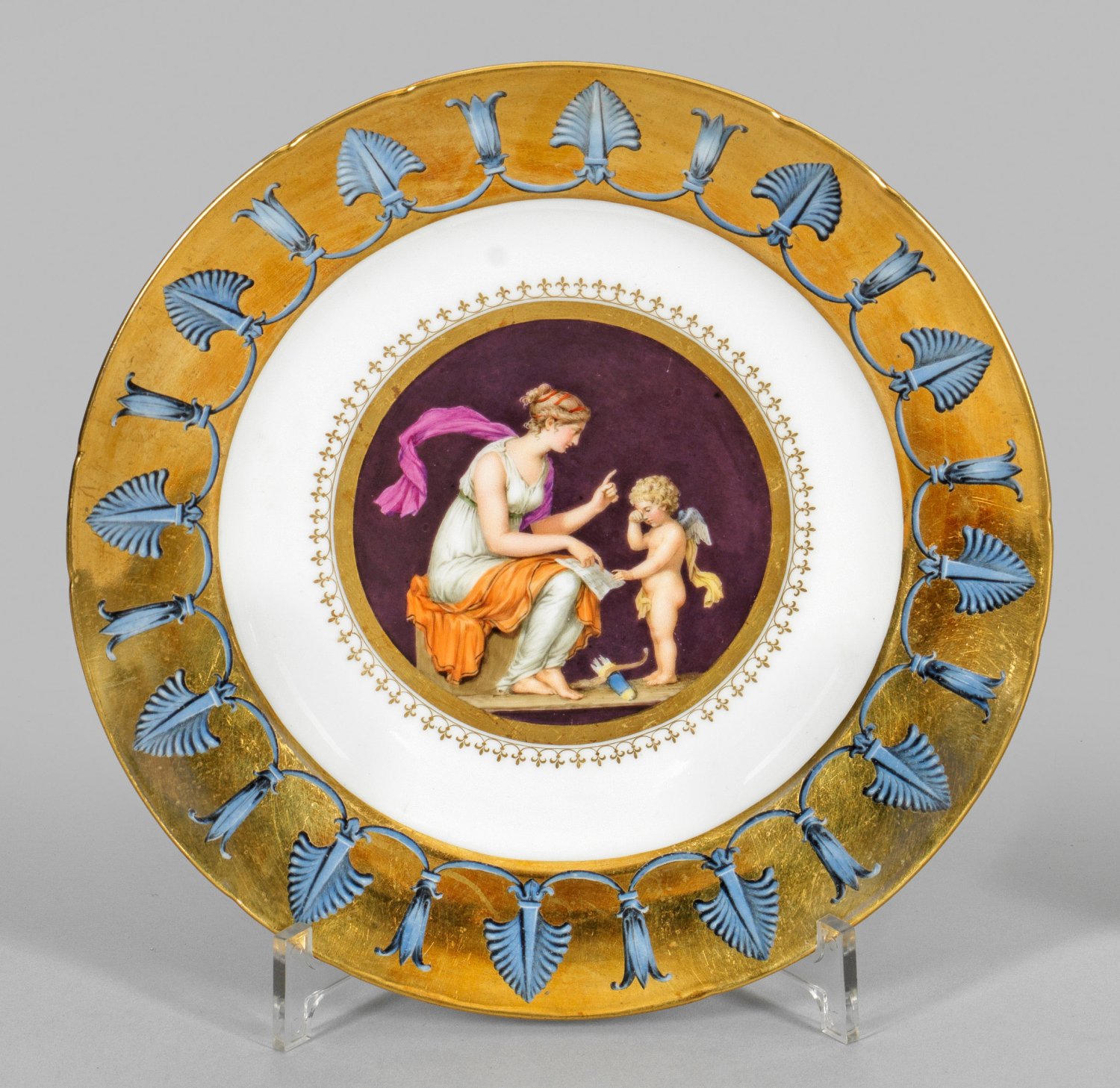 Runde Form, zwölffach eingezogener Rand. Im leicht vertieften Spiegel goldgerahmtes Medaillon mit "Fleurs de Lys"-Bordüre. Darin mythologische Szene mit antikisierend gekleideter, junger Frau mit erhobenem Zeigefinger den vor ihr stehenden Amor ermahnend, der sich die Augen reibt. Auf der Fahne, im Goldfond ausgesparte, stilisierte Ornamentbordüre aus Palmetten und Blütenmotiven in hellem, schwarz schattiertem Blau. Eisenrote schablonierte Manufakturmarke. D. 24,5 cm.
