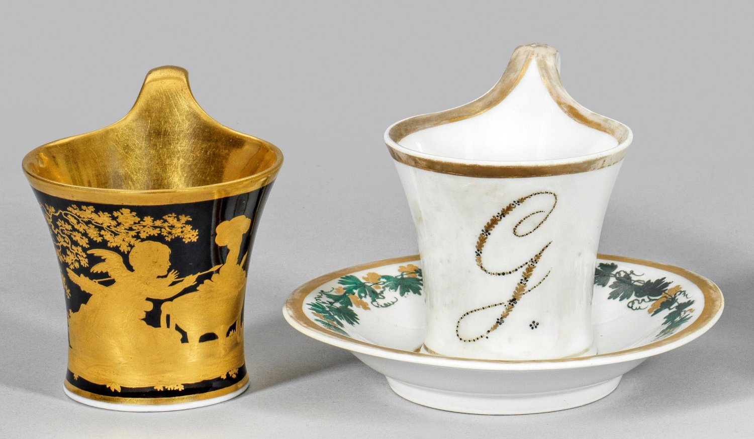 Two porcelain cups gold-painted with cupid scene and colour-painted monogram. In addition KPM Berlin saucer. Signs of age. Rubbed. Sceptre mark.