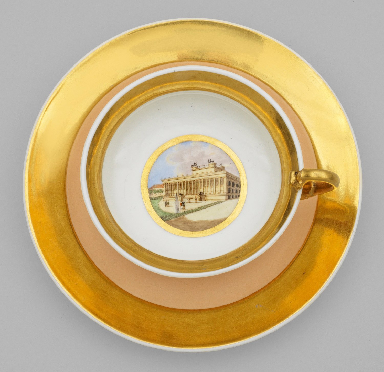 auf flacher Untertasse. Niedrige, gedrückte, unterhalb konvex gewölbte Schalenform. Seitlich hochgezogener Henkel mit Blattansätzen. Lachsfarbener Fond. Auf dem Innenboden goldkonturiertes Medaillon mit Berliner Ansicht des, für den preußischen König Friedrich Wilhelms III. von Karl Friedrich Schinkel erbauten Alten Museum am Lustgarten in polychromer Malerei. Reiche Vergoldung. Zepter- und Malereimarke. H. 5,5 cm. D. 10 cm - 15,5 cm.