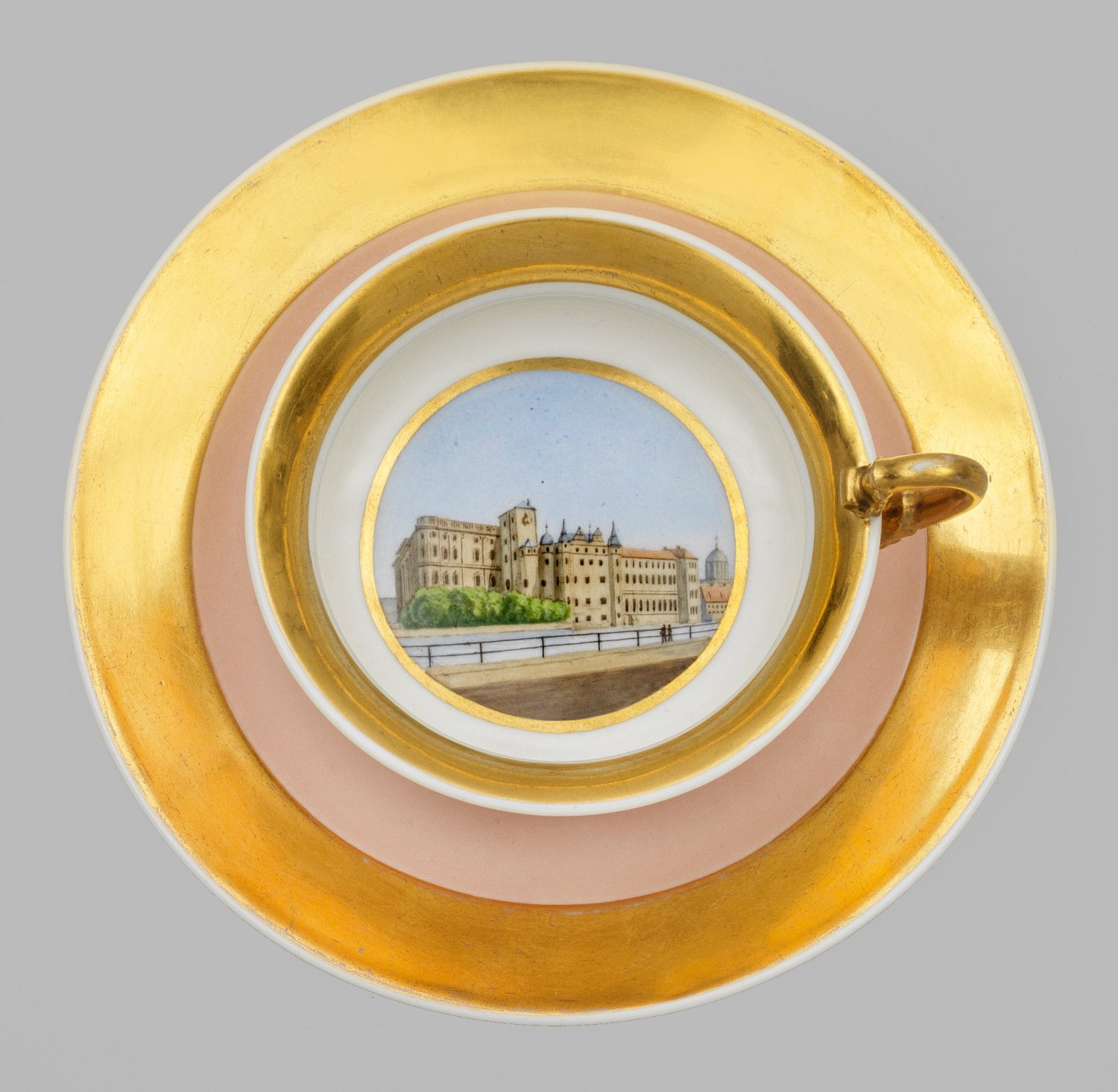 auf flacher Untertasse. Niedrige, gedrückte, unterhalb konvex gewölbte Schalenform. Seitlich hochgezogener Henkel mit Blattansätzen. Altrosafarbener Fond. Auf dem Innenboden goldkonturiertes Medaillon mit Ansicht des Berliner Schlosses mit dem zur Spree gerichtetem Flügel von der Burgstraße aus. Polychrome Malerei mit reicher Vergoldung. Gold minim. ber.; Zepter- und Malereimarke. H. 5,5 cm. D. 10 cm - 15,5 cm.