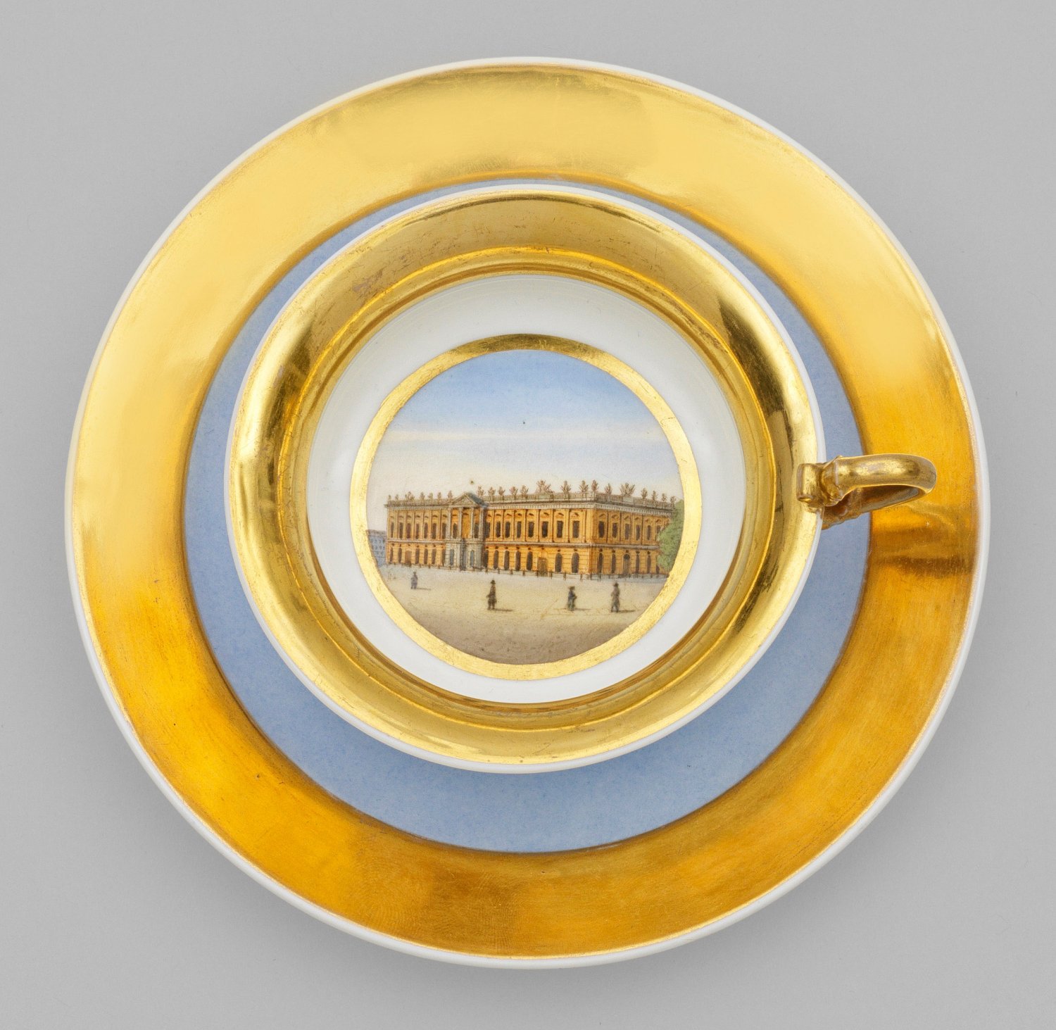 A topographical Biedermeier sky-blue ground porcelain cup on saucer finely painted with a view of the Arsenal in Berlin. Sceptre, KPM and painter's mark.