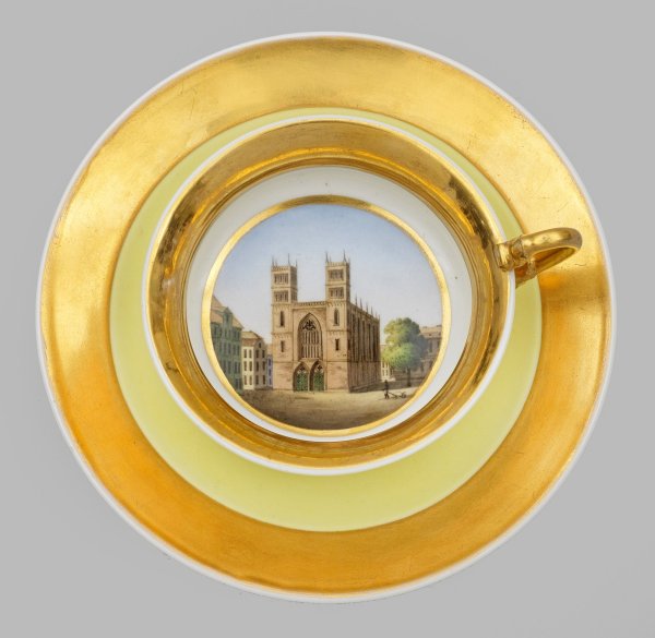 auf flacher Untertasse. Niedrige, gedrückte, unterhalb konvex gewölbte Schalenform. Seitlich hochgezogener Henkel mit Blattansätzen. Zitronengelber Fond. Auf dem Innenboden goldkonturiertes Medaillon mit Ansicht der Wederschen Kirche (auch Friedrichswerdersche Kirche) im gotischen Stil nach Vorlage eines Gemäldes von Carl Freydanck, neu erbaut im Auftrag des preußischen Kronprinzen Friedrich Wilhelm nach Plänen von Karl Friedrich Schinkel um 1824 - 1830. Malerzeichen in Gold. Polychrome Malerei mit reicher Vergoldung. Gold minim. ber.; Zepter- und Malereimarke. H. 5,5 cm. D. 10 cm - 15,5 cm.