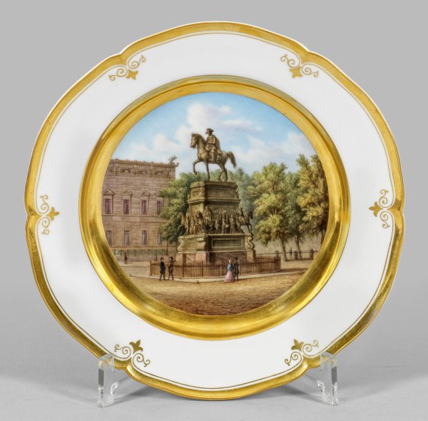 Rund, passig geschweifte Form. Im vertieften Spiegelmedaillon Ansicht des, von Christian Daniel Rauch 1851 fertiggestellten Reiterdenkmals des preußischen Königs Friedrich II., genannt Friedrich der Große, dargestellt zu Pferd in Uniform mit Dreispitz über mehrstufigem Sockel. Im Hintergrund das Wilhelms-Palais ("Altes Palais") Unter den Linden zu Berlin in feiner, polychromer Malerei. Ornamental verzierter Goldrand sowie vergoldete Kehle. Rücks. bez.; Zepter-, Pfennig- und Malereimarke. D. 23 cm.