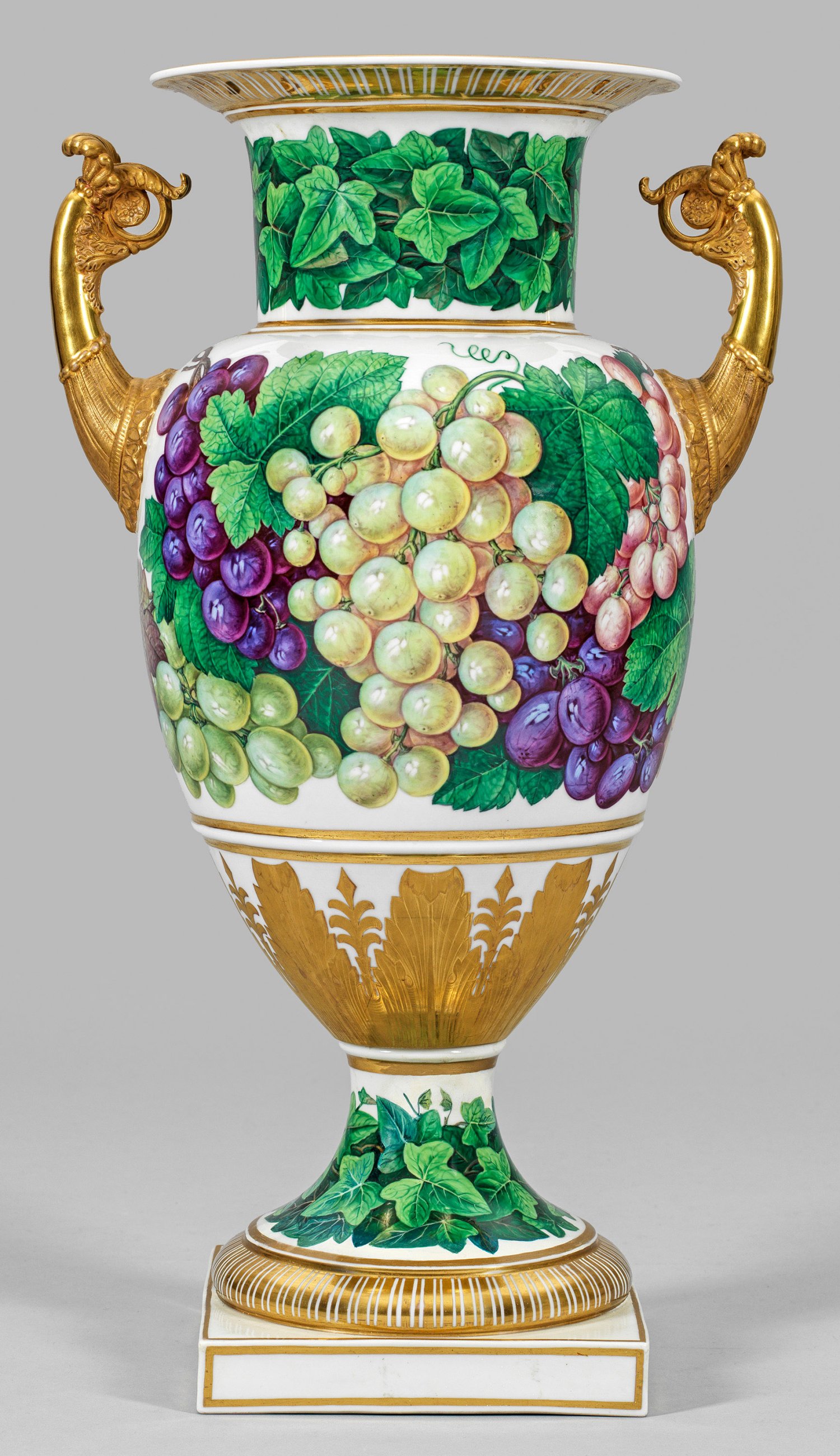 Sog. "Französische Vase". Teilw. Biskuitporzellan. Auf quadratischer Plinthe amphorenförmiger Korpus mit abgesetztem Hals und ausladendem Rand. Seitlich hochgezogene Handhaben in Form von Akanthusblattvoluten. Beidseitig der Wandung großflächig angelegter Traubendekor, an Fuß und Hals umlaufender Fries aus Efeublättern. Polychrome Malerei (wohl später). Teilw. radierte Golddekor und -staffage. Rest.; Underglasurblaue KPM-Adlermarke. H. 54 cm.