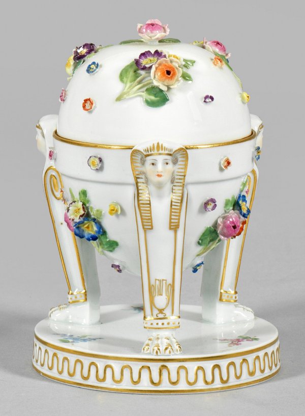 Ovoider, von drei Sphingenhermen getragener Korpus mit gewölbtem Deckel über Rundplinthe. Auf der Wandung plastisch aufgelegte Blumenbuketts und Streublumen, die Plinthe mit Blütenzweigen. Polychrome Malerei mit reicher Goldstaffage. Modell-Nr. P 81. Schwertermarke. H. 14 cm.