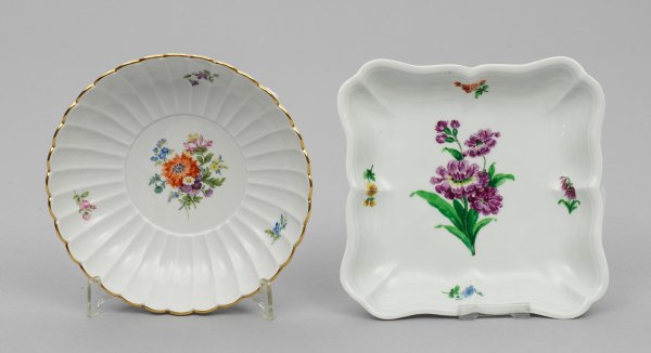 Rund mit blütenblatthafter Randgestaltung bzw. quadratisch mit geschweiftem Rand. Jeweils mit Blumenarrangement im Spiegel und einzelnen Blumen auf der Fahne in polychromer Malerei, teilw. Goldrand. Schwertermarke. D. 21 cm - 26 cm.