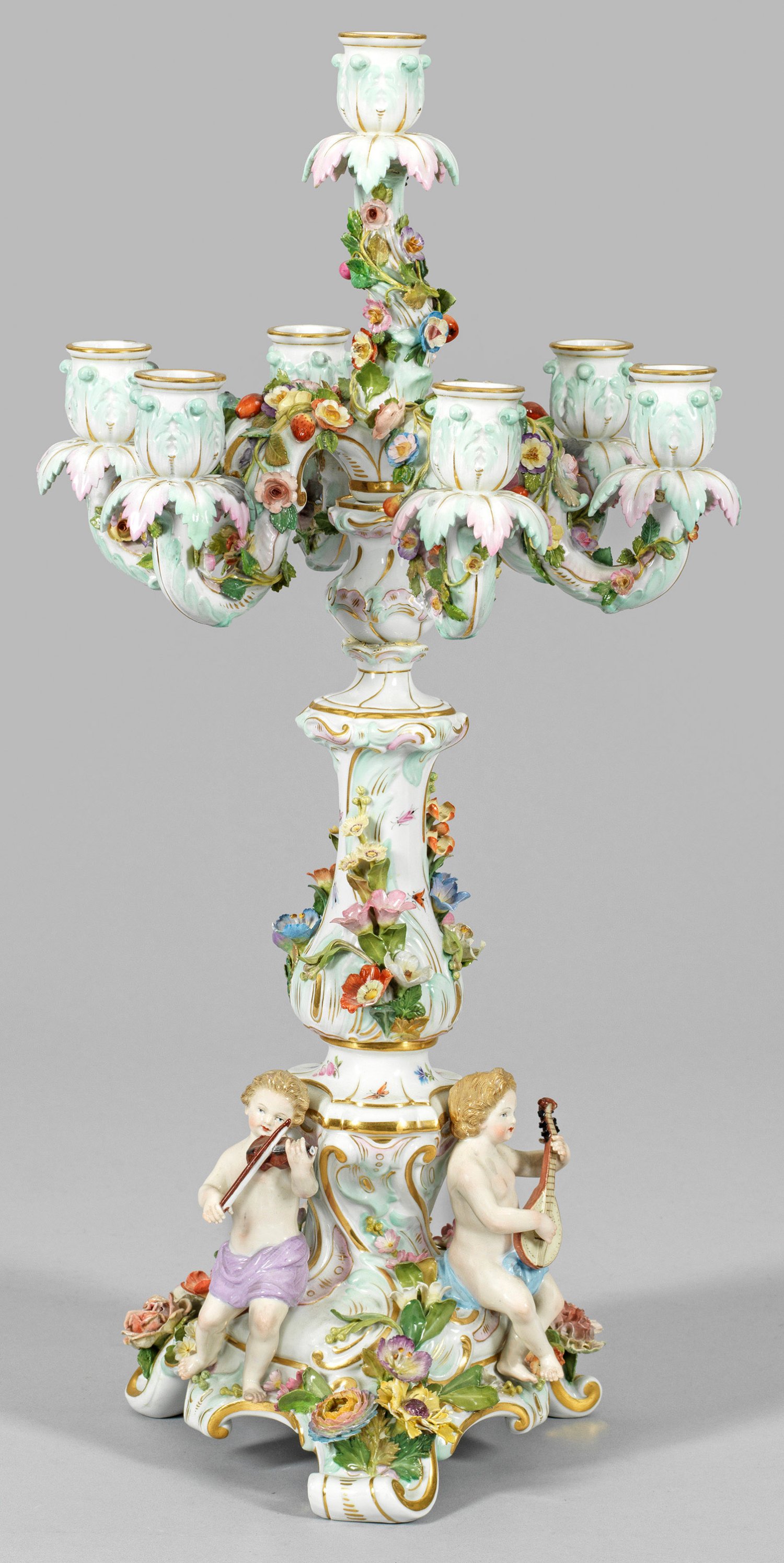 1- bzw. 7-flg.; Über dreiseitig volutiertem Fuß mit musizierenden Puttenfiguren mehrfach gegliederter, balusterförmiger Schaft, in vasenförmiger Tülle endend. Reicher, plastischer Blütendekor. Siebenflammiger Tüllenaufsatz mit geschweiften, rankenumzogenen Leuchterarmen. Polychrome Streublumen- und Insektenmalerei mit Goldstaffage. Entw. Ernst August Leuteritz. Modell-Nr. G 194. Unw. best./rest.; Schwertermarke. H. 57 cm.