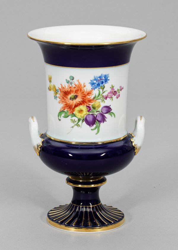 Seitlich ansetzende, gebogte Henkel. Teilw. kobaltblauer Fond. Beidseitig der Wandung farbenprächtiges Blumengebinde in polychromer Malerei. Goldstaffage. Schwertermarke. H. 28,5 cm.