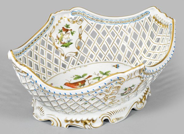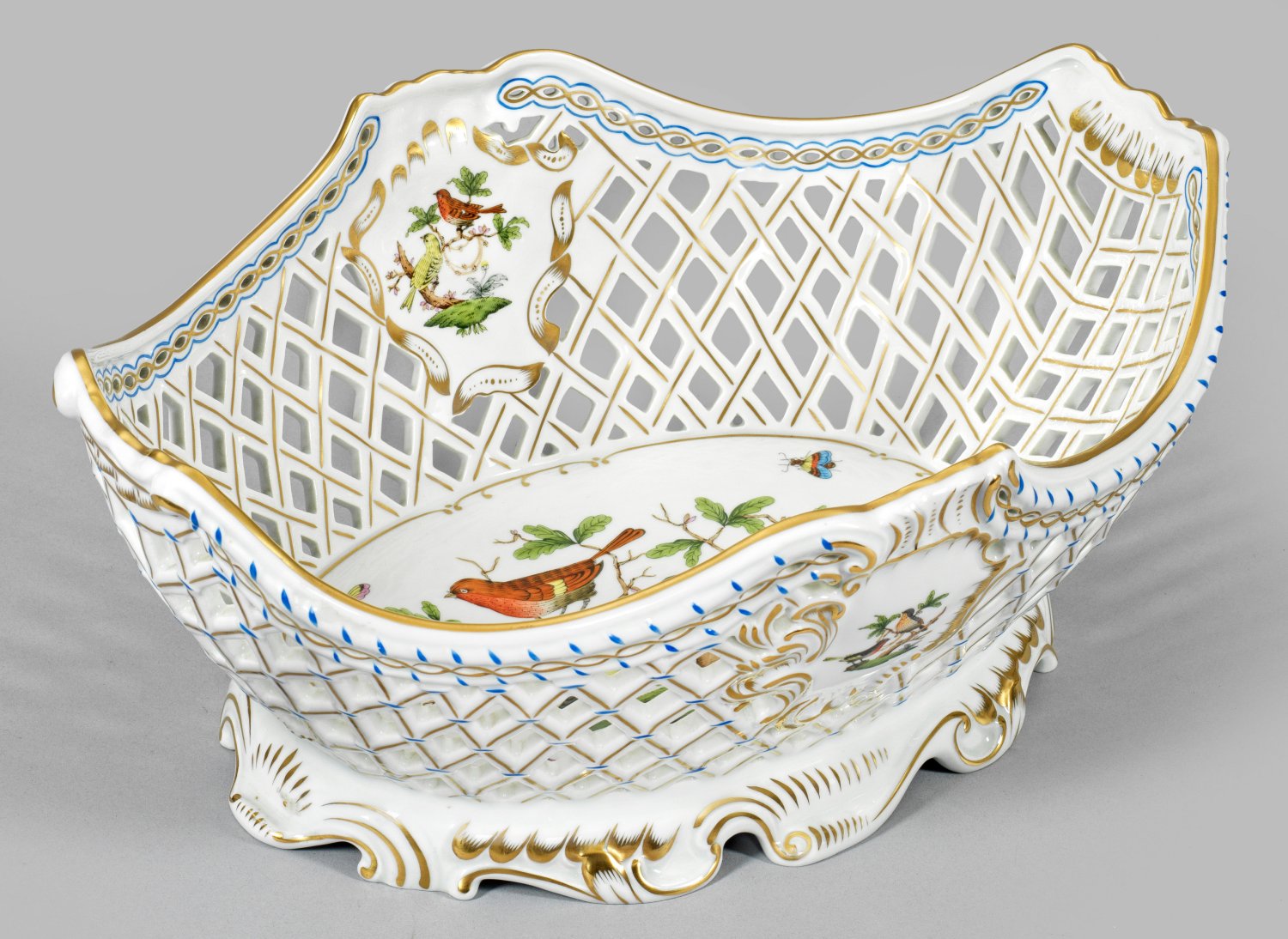 Ovaler Fuß, durchbrochen gearbeitete Wandung. Dekor aus Vogelpärchen und -gruppen in naturalistischer Umgebung im Spiegel und beidseitig der Wandung umgeben von Fluginsekten. Polychrome Malerei. Goldstaffage. Fuß best.; Manufakturmarke. L 42 cm.