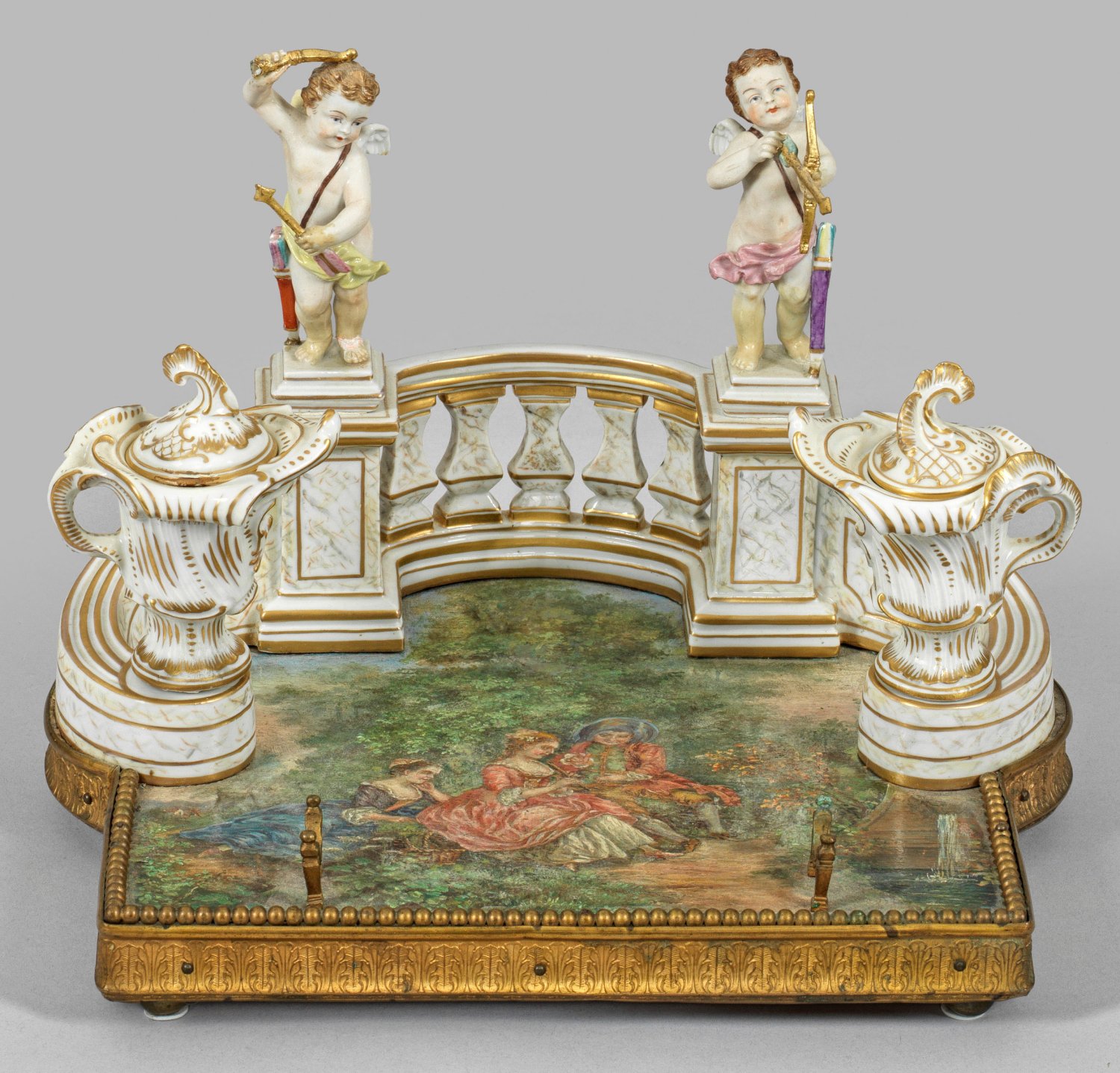 Polychrom bemalte Holzplatte mit Watteauszene, umlaufend applizierte Messingzierleiste. Darauf passig geschweifte, marmorierte Balustrade aus Porzellan mit Amorfigurinen auf Podestsockeln. Flankierend zwei herausnehmbare Rocaillevasen mit Deckel als Tintenfass sowie Stifthalterung. Polychrome Malerei mit Goldstaffage. Teilw. rest.; Platte 26 cm x 20 cm.