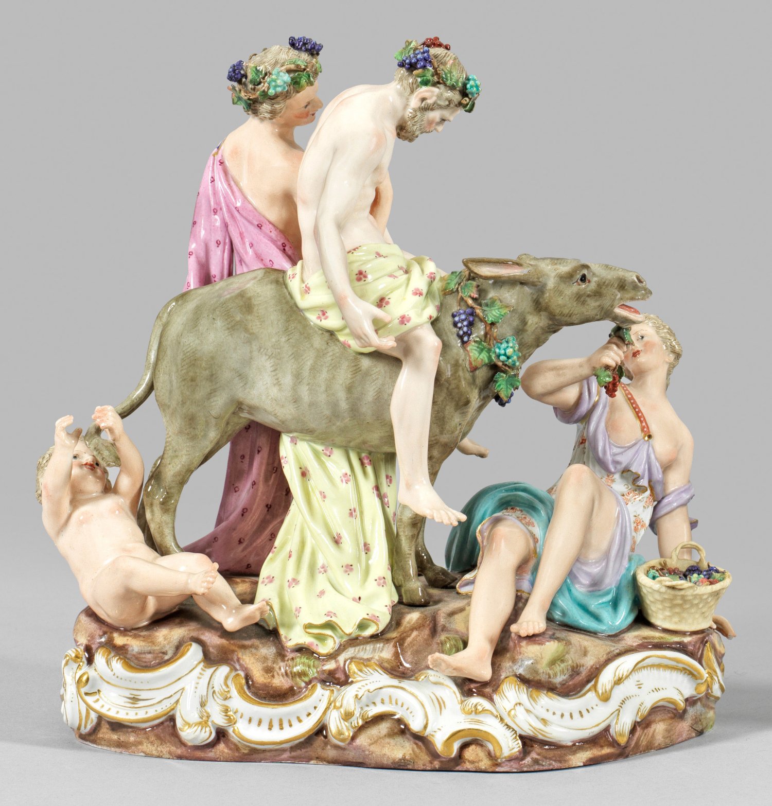 Gehöhter, stark rocaillereliefierter Felssockel. Auf einem, von einer Weintraubenranke geschmückten Esel sitzender, trunkener, bekränzter Silen, begleitet von dem jungen Bacchus. Am Boden sitzende junge Bacchantin, den Esel mit Weintrauben fütternd sowie eine spielende Amorette. Polychrome Malerei mit Goldstaffage. Entw. E. A. Leuteritz nach F. E. Meyer um 1760. Modell-Nr. 2724. Minim. best./rest.; Schwertermarke. H. 21,5 cm.