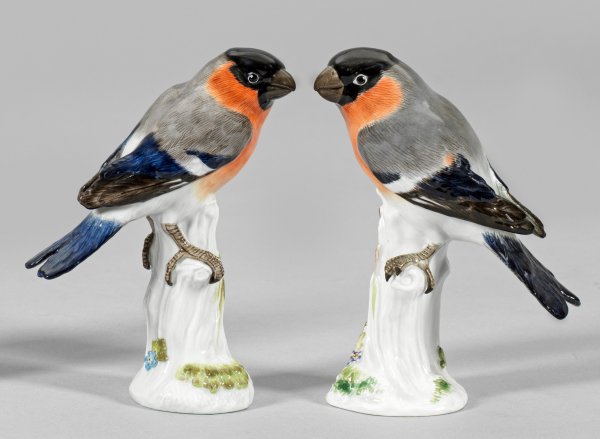 A pair of porcelain figures of Eurasian bullfinches as counterparts. Date mark. Crossed swords mark.