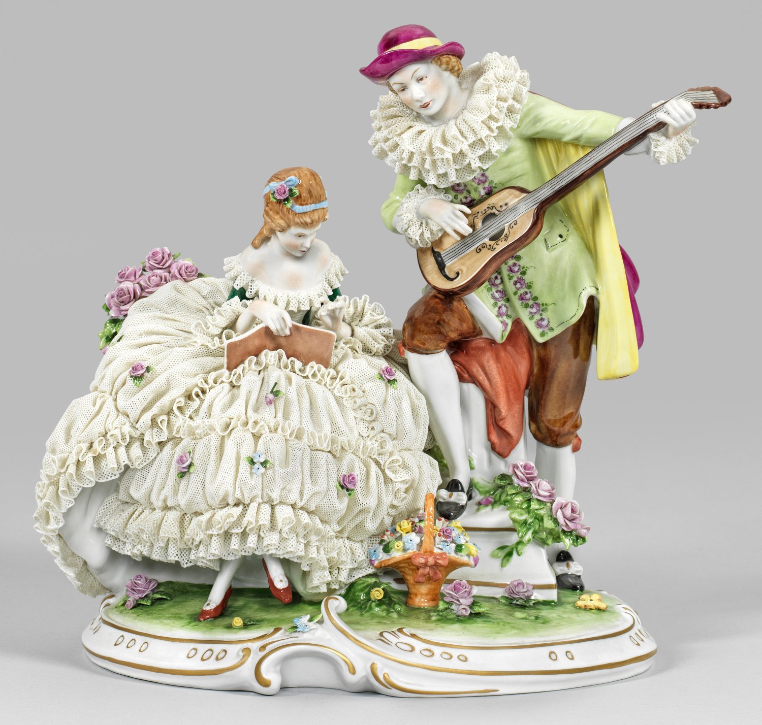 Geschweifter, goldkonturierter Ovalsockel. Sitzende, junge Frau und Harlekin mit Gitarre beim Musizieren. Umlaufend plastischer Blütendekor. Die Kleidung mit feinem Spitzenputz. Polychrome Malerei. Manufakturmarke. H. 30,5 cm.