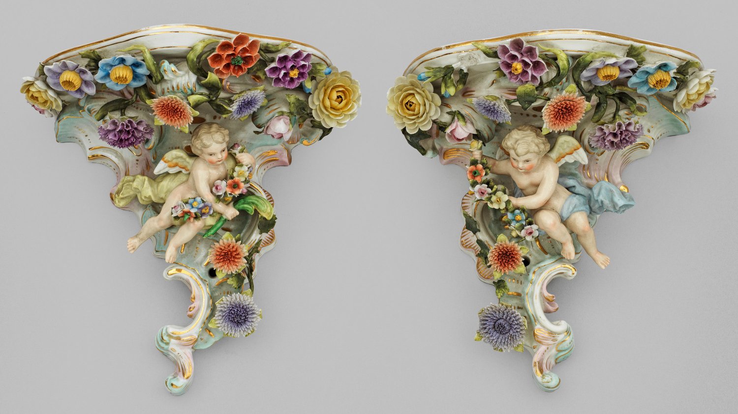 A pair of Thuringian porcelain brackets with putti and applied flower decor. Damaged. Chipped. Gold rubbed. Manufacturer's mark.