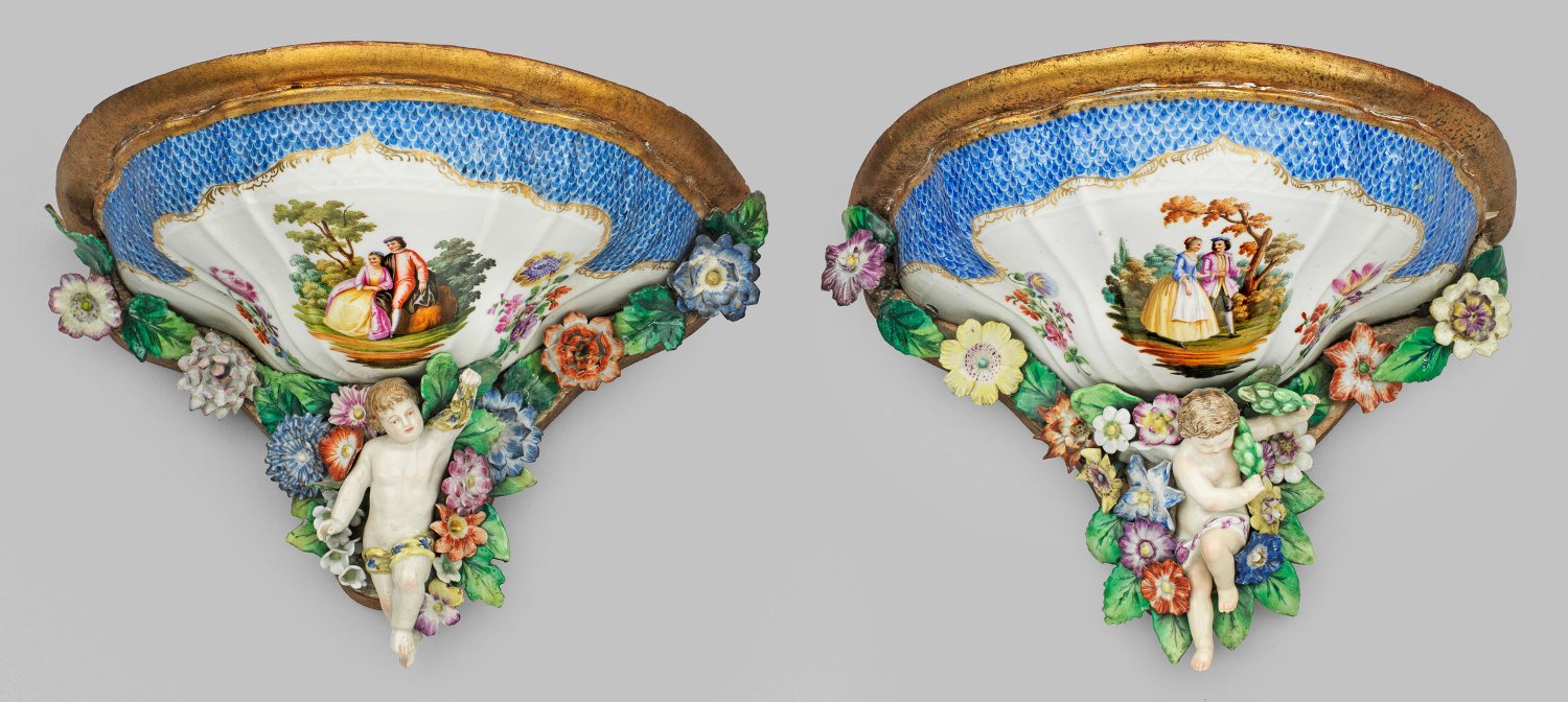 A pair of Thuringian porcelain wall brackets with Watteau scene and applied cupid and flowers. Parly insignificantly restored.