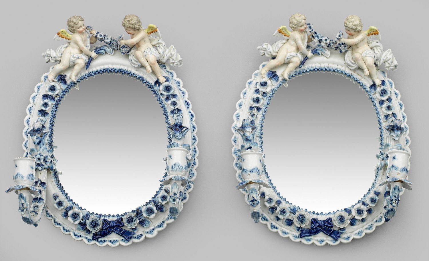 Ovale Spiegelrahmung mit Reliefdekor und aufgelegten Blumenarrangements, bekrönt von vollplastischen Amoretten, eine Blumengirlande haltend. Unterhalb zwei bewegliche Leuchterarme mit vasenförmiger Tülle über Blattkranz. Unterglasurblaue- und dezente polychrome Aufglasurmalerei. Unw. best.; Manufakturmarke. H. 33,5 cm. 26,5 cm x 12 cm.