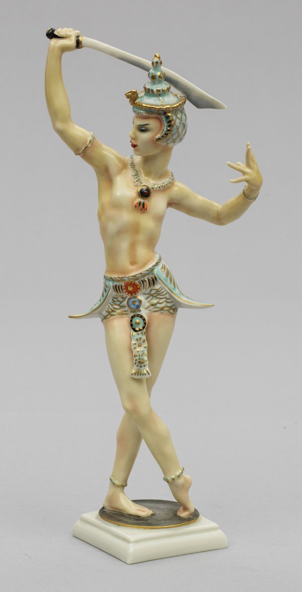 In expressiver Pose stehender Schwerttänzer in prächtigem Kostüm. Polychrome Malerei mit Goldstaffage. Entw. Carl Werner. Entw.-Bez.; Minim. best.; Manufakturmarke. H. 31 cm.